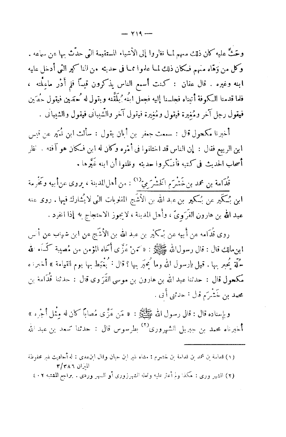 888 - قدامَة بن مُحَمَّد بن خشرم الخشرمي من أهل الْمَدِينَةِ يروي عَن أَبِيه ومخرمة بن بكير عَن بكير بن عبد الله بن الْأَشَج المقلوبات الَّتِي لَا يُشَارك فِيهَا روى عَنهُ عبد الله بن هَارُون الْفَروِي وَأهل الْمَدِينَة لَا يَجُوز الِاحْتِجَاج بِهِ إِذَا انْفَرد رَوَى قُدَامَةُ عَنْ أَبِيهِ عَن بكير بن عبد الله بن الْأَشَج عَن بن شِهَابٍ عَنْ أَنَسِ بْنِ مَالِكٍ قَالَ قَالَ رَسُولُ اللَّهِ صَلَّى اللَّهُ عَلَيْهِ وَسَلَّمَ مَنْ عَزَّى أَخَاهُ الْمُؤْمِنَ مِنْ مُصِيبَةٍ كَسَاهُ اللَّهُ حُلَّةً يُحَبَّرُ بِهَا قِيلَ يَا رَسُولَ اللَّهِ وَمَا يُحَبَّرُ بِهَا قَالَ يُغْبَطُ بِهَا يَوْمَ الْقِيَامَةِ أَخْبَرَنَاهُ مَكْحُولٌ قَالَ حَدَّثَنَا عَبْدُ اللَّهِ بْنُ هَارُونَ بْنِ مُوسَى الْقَرَوِيُّ قَالَ حَدَّثَنَا قُدَامَةُ بْنُ مُحَمَّدِ بْنِ خَشْرَمٍ قَالَ حَدَّثَنِي أَبِي وَبِإِسْنَادِهِ قَالَ قَالَ رَسُولُ اللَّهِ صَلَّى اللَّهُ عَلَيْهِ وَسَلَّمَ مَنْ عَزَّى مُصَابًا كَانَ لَهُ مِثْلُ أَجْرِهِ أَخْبَرَنَاهُ مُحَمَّدُ بن جِبْرِيل الشهروري بِطَرَسُوسَ قَالَ حَدَّثَنَا سَعْدُ بْنُ عبد الله
