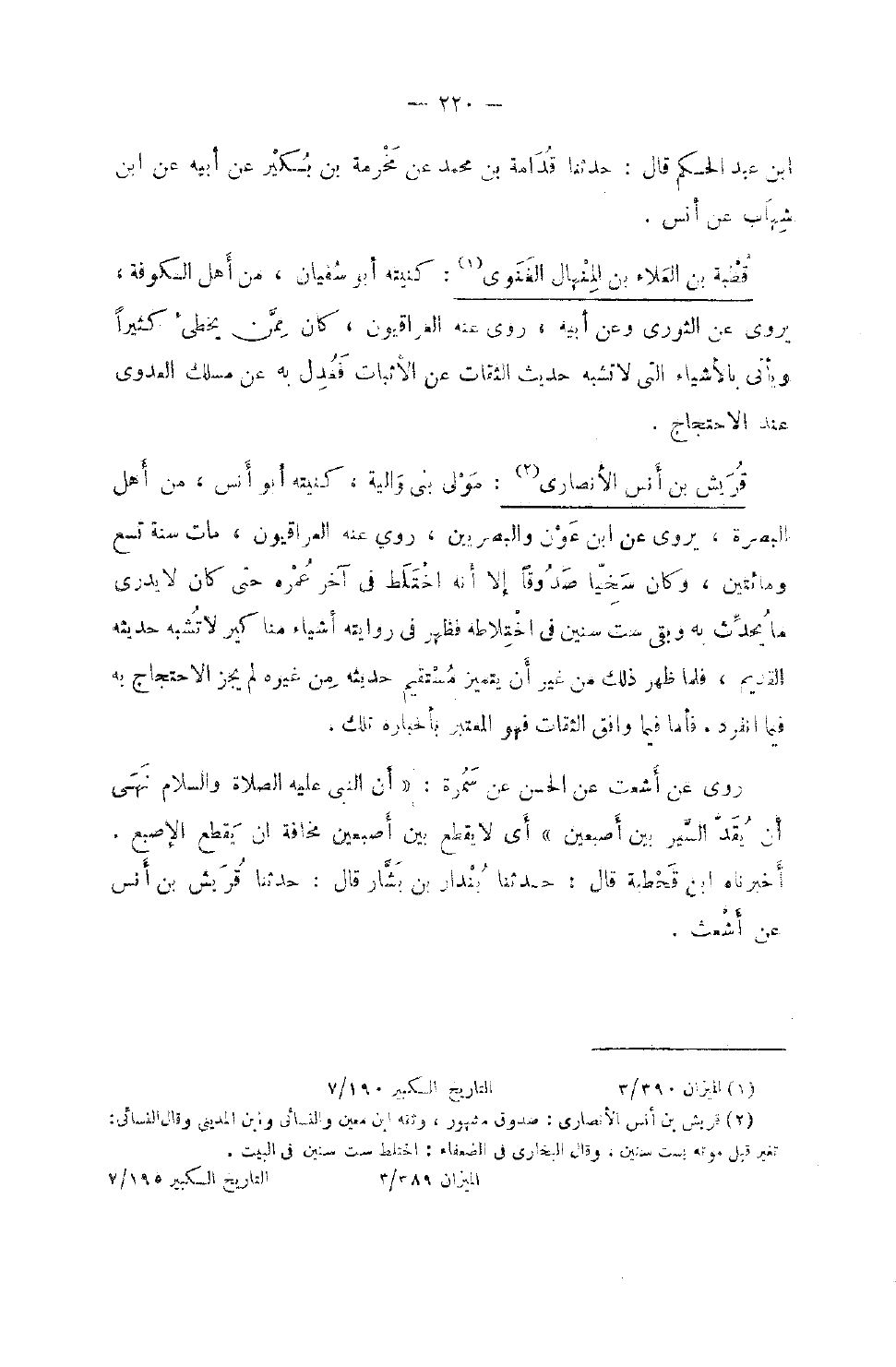 890 - قُرَيْش بن أنس الْأنْصَارِيّ مولى بني والية كنتيه أَبُو أنس من أهل الْبَصْرَة يروي عَن بن عون والبصريين روى عَنهُ الْعِرَاقِيُّونَ مَاتَ سنة تسع وَمِائَتَيْنِ وَكَانَ سخيا صَدُوقًا إِلَّا أَنه اخْتَلَط فِي آخر عمره حَتَّى كَانَ لَا يدْرِي مَا يحدث بِهِ بَقِي سِتّ سِنِين فِي اخْتِلَاطه فَظهر فِي رِوَايَته أَشْيَاء مَنَاكِير لَا تشبه حَدِيثه الْقَدِيم فَلَمَّا ظهر ذَلِك من غير أَن يتَمَيَّز مُسْتَقِيم حَدثهُ من غَيره لم يجز الِاحْتِجَاج بِهِ فِيمَا انْفَرد فَأَما فِيمَا وَافق الثِّقَات فَهُوَ الْمُعْتَبر بأخباره تِلْكَ رَوَى عَنْ أَشْعَثَ عَنِ الْحَسَنِ عَنْ سَمُرَةَ أَنَّ النَّبِيَّ صَلَّى اللَّهُ عَلَيْهِ وَسَلَّمَ نَهَى أَنْ يُقَدَّ السَّيْرُ بَيْنَ إِصْبُعَيْنِ أَيْ لَا يُقْطَعُ بَيْنَ إِصْبُعَيْنِ مَخَافَة أَن يقطع الْأَصَابِع أخبرناه بن قَحْطَبَةَ قَالَ حَدَّثَنَا بُنْدَارُ بْنُ بَشَّارٍ قَالَ حَدَّثَنَا قُرَيْشُ بْنُ أنس عَن أَشْعَث
