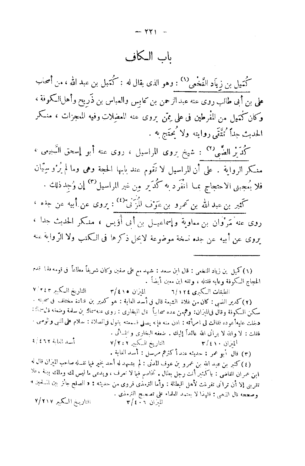 891 - كميل بن زِيَاد النَّخعِيّ وَهُوَ الَّذِي يُقَال لَهُ كميل بن عبد الله منأصحاب عَلِي بْن أَبِي طَالِب روى عَنهُ عبد الرَّحْمَن بن عَابس وَالْعَبَّاس بن ذريح وَأهل الْكُوفَة وَكَانَ كميل من المفرطين فِي عَليّ مِمَّن يروي عَنهُ المعضلات وَفِيه المعجزات مُنكر الحَدِيث جدا تتقى رِوَايَته وَلَا يحْتَج بِهِ