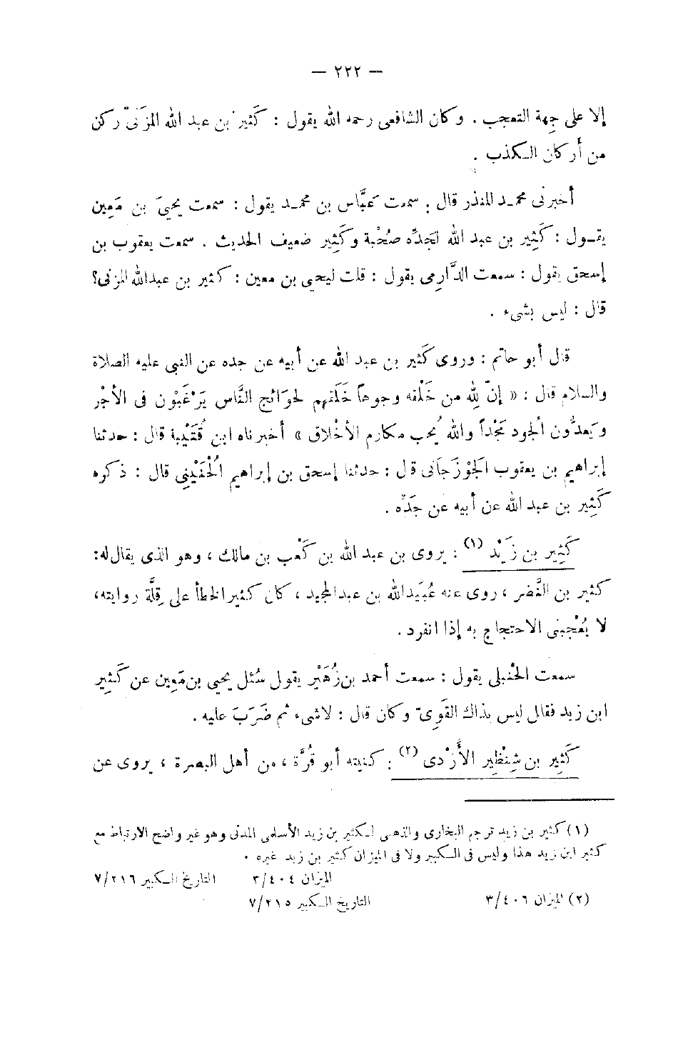إِلَّا على جِهَة التَّعَجُّب وَكَانَ الشَّافِعِي رَحمَه الله يَقُول كثير بن عبد الله الْمُزنِيّ ركن من أَرْكَان الْكَذِب أَخْبرنِي مُحَمَّد الْمُنْذِرِ قَالَ سَمِعْتُ عَبَّاسَ بْنَ مُحَمَّد يَقُول سَمِعت يحيى بن معِين يَقُول كثير بن عبد الله لجده صُحْبَة وَكثير ضَعِيف الحَدِيث سَمِعت يَعْقُوب بن إِسْحَاق يَقُولُ سَمِعْتُ الدَّارِمِيَّ يَقُولُ قُلْتُ ليحيى بن معِين كثير بن عبد الله الْمُزنِيّ قَالَ لَيْسَ بِشَيْءٍ قَالَ أَبُو حَاتِم وَرَوَى كَثِيرُ بْنُ عَبْدِ اللَّهِ عَنْ أَبِيهِ عَنْ جَدِّهِ عَنِ النَّبِيِّ صَلَّى اللَّهُ عَلَيْهِ وَسَلَّمَ قَالَ إِن لله من خَلفه وُجُوهًا خَلَقَهُمْ لِحَوَائِجِ النَّاسِ يَرْغَبُونَ فِي الأَجْرِ وَيَعُدُّونَ الْجُودَ مَجْدًا وَاللَّهُ يُحِبُّ مَكَارِمَ الأَخْلاقِ أَخْبَرَنَاهُ بن قُتَيْبَةَ قَالَ حَدَّثَنَا إِبْرَاهِيمُ بْنُ يَعْقُوبَ الْجَوْزِجَانِيُّ قَالَ حَدَّثَنَا إِسْحَاقُ بْنُ إِبْرَاهِيمَ الْحُنَيْنِيُّ قَالَ ذَكَرَهُ كَثِيرُ بْنُ عَبْدِ اللَّهِ عَنْ أَبِيه عَن جده