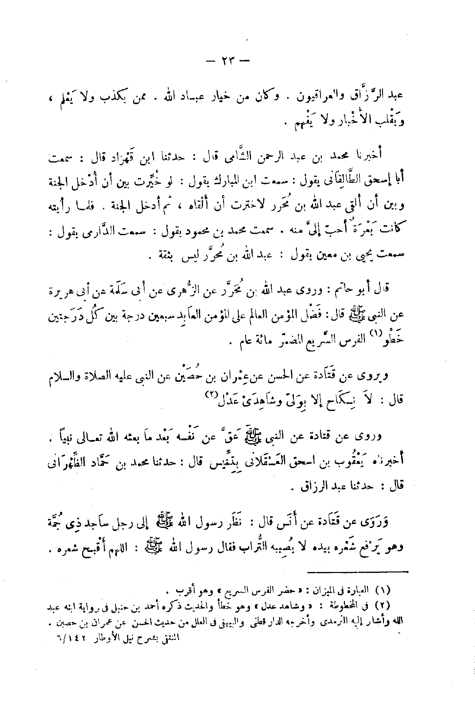عبد الرَّزَّاق والعراقيون وَكَانَ من خِيَار عباد الله مِمَّن يكذب وَلَا يعلم ويلقب الْأَخْبَار وَلَا يفهم أخبرنَا مُحَمَّد بن عبد الرَّحْمَن الشَّامي قَالَ حَدثنَا بن قهزاد قَالَ سَمِعت أَبَا إِسْحَاق الطَّالقَانِي يَقُول سَمِعت بن الْمُبَارك يَقُول لَو خيرت بَين أَن أَدخل الْجنَّة وَبَين أَن ألْقى عبد الله بن مُحَرر لاخترت أَن أَلْقَاهُ ثمَّ أَدخل الْجنَّة فَلَمَّا رَأَيْته كَانَت بَعرَة أحب إِلَيّ مِنْهُ سَمِعت مُحَمَّد بْنَ مَحْمُودٍ يَقُولُ سَمِعْتُ الدَّارِمِيَّ يَقُول سَمِعت يحيى بن معِين يَقُول عبد الله بن مُحَرر لَيْسَ بِثِقَةٍ قَالَ أَبُو حَاتِم وَرَوَى عَبْدُ اللَّهِ بْنُ مُحَرَّرٍ عَنِ الزُّهْرِيِّ عَنْ أَبِي سَلَمَةَ عَنْ أَبِي هُرَيْرَةَ عَنِ النَّبِيِّ صَلَّى اللَّهُ عَلَيْهِ وَسَلَّمَ قَالَ فُضِّلَ الْمُؤْمِنُ الْعَالِمُ عَلَى الْمُؤْمِنِ الْعَابِدِ سَبْعِينَ دَرَجَةً بَيْنَ كُلِّ دَرَجَتَيْنِ خَطْوُ الْفَرَسِ السَّرِيعِ الْمُضْمَرِ مِائَةَ عَامٍ وَيَرْوِي عَنْ قَتَادَةَ عَنِ الْحَسَنِ عَنْ عِمْرَانَ بْنِ حُصَيْن عَن النَّبِي صَلَّى اللَّهُ عَلَيْهِ وَسَلَّمَ قَالَ لَا نِكَاحَ إِلا بِوَلِيٍّ وَشَاهِدَيْ عَدْلٍ وَرَوَى عَنْ قَتَادَةَ عَنِ النَّبِيِّ صَلَّى اللَّهُ عَلَيْهِ وَسَلَّمَ عَقَّ عَنْ نَفْسِهِ بعد مَا بَعَثَهُ اللَّهُ تَعَالَى نَبِيًّا أَخْبَرَنَاهُ يَعْقُوبُ بْنُ إِسْحَاقَ الْعَسْقَلانِيُّ بِتِنِّيسَ قَالَ حَدَّثَنَا مُحَمَّدُ بْنُ حَمَّادٍ الظَّهْرَانِيُّ قَالَ حَدَّثَنَا عَبْدُ الرَّزَّاقِ وَرَوَى عَنْ قَتَادَةَ عَنْ أَنَسٍ قَالَ نَظَرَ رَسُولُ اللَّهِ صَلَّى اللَّهُ عَلَيْهِ وَسَلَّمَ إِلَى رَجُلٍ سَاجِدٍ ذِي جُمَّةٍ وَهُوَ يَرْفَعُ شَعْرَهُ بِيَدِهِ لَا يُصِيبُهُ التُّرَابُ فَقَالَ رَسُولُ اللَّهِ صَلَّى اللَّهُ عَلَيْهِ وَسَلَّمَ اللَّهُمَّ أَقْبِحْ شَعْرَهُ
