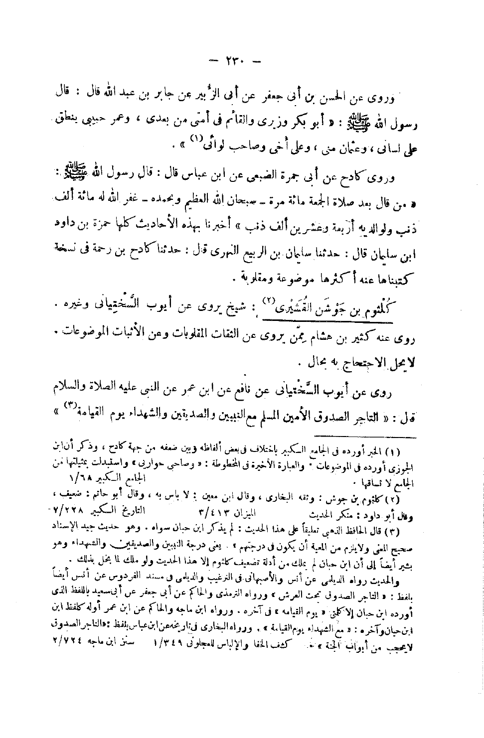 905 - كُلْثُوم بن جوشن الْقشيرِي شيخ يروي عَن أَيُّوب السّخْتِيَانِيّ وَغَيره روى عَنهُ كثير بن هِشَام مِمَّن يَرْوِي عَن الثِّقَات المقلوبات وَعَن الْأَثْبَات الموضوعات لَا يحل الِاحْتِجَاج بِهِ بِحَال رَوَى عَنْ أَيُّوبَ السّخْتِيَانِيّ عَن نَافِع عَن بن عُمَرَ عَنِ النَّبِيِّ صَلَّى اللَّهُ عَلَيْهِ وَسلم قَالَ التَّاجِرُ الصَّدُوقُ الأَمِينُ الْمُسْلِمُ مَعَ النَّبِيِّينَ وَالصِّدِّيقِينَ وَالشُّهَدَاءِ يَوْمَ الْقِيَامَة
