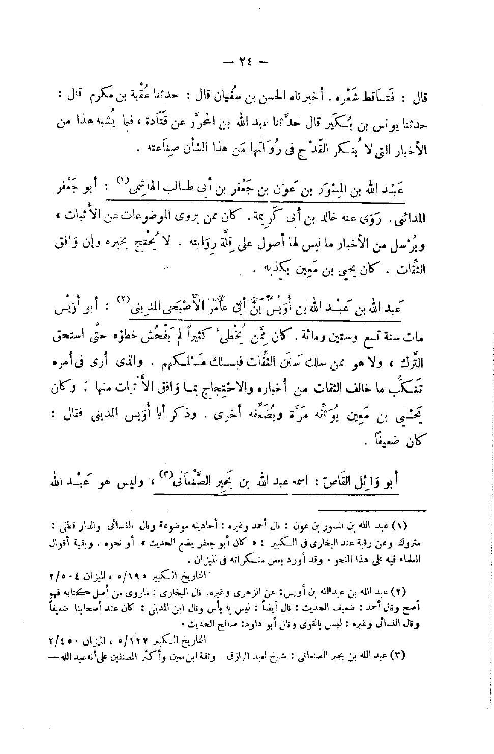 552 - عبد الله بن الْمسور بن عون بن جَعْفَر بن أبي طَالب الْهَاشِمِي أَبُو جَعْفَر الْمَدَائِنِي روى عَنهُ خَالِد بن أبي كَرِيمَة كَانَ مِمَّن يروي الموضوعات عَن الْأَثْبَات وَيُرْسل من الْأَخْبَار مَا لَيْسَ لَهَا أصُول على قلَّة رِوَايَته لَا يحْتَج بِخَبَرِهِ وَإِن وَافق الثِّقَات كَانَ يحيى بن معِين يكذبهُ