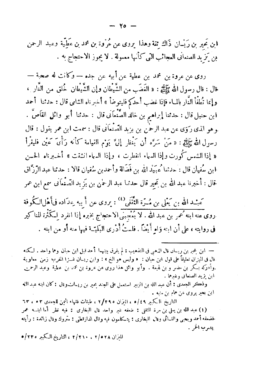 بن بحير بن ريسان ذَاك ثِقَة وَهَذَا يروي عَن عُرْوَة بن مُحَمَّد بن عَطِيَّة وَعبد الرَّحْمَن بن يزِيد الصَّنْعَانِيّ الْعَجَائِب الَّتِي كَأَنَّهَا معمولة لَا يجوز الِاحْتِجَاج بِهِ رَوَى عَنْ عُرْوَةَ بْنِ مُحَمَّدِ بْنِ عَطِيَّةَ عَنْ أَبِيهِ عَنْ جَدِّهِ وَكَانَتْ لَهُ صُحْبَةٌ قَالَ قَالَ رَسُولُ اللَّهِ صَلَّى اللَّهُ عَلَيْهِ وَسَلَّمَ الْغَضَبُ مِنَ الشَّيْطَانِ وَإِنَّ الشَّيْطَانَ خُلِقَ من النَّار وَإِنَّمَا تطفأالنار بِالْمَاءِ فَإِذَا غَضِبَ أَحَدُكُمْ فَلْيَتَوَضَّأْ أَخْبَرَنَاهُ السَّامِيُّ قَالَ حَدَّثَنَا أَحْمَدُ بْنُ حَنْبَلٍ قَالَ حَدَّثَنَا إِبْرَاهِيمُ بْنُ خَالِدٍ الصَّنْعَانِيُّ قَالَ حَدَّثَنَا أَبُو وَائِلٍ الْقَاصُّ وَهُوَ الَّذِي رَوَى عَنْ عَبْدِ الرَّحْمَنِ بْنِ يزِيد الصَّنْعَانِيّ قَالَ سَمِعت بن عُمَرَ يَقُولُ قَالَ رَسُولُ اللَّهِ صَلَّى اللَّهُ عَلَيْهِ وَسَلَّمَ مَنْ سَرَّهُ أَنْ يَنْظُرَ إِلَى يَوْمِ الْقِيَامَةِ كَأَنَّهُ رَأْيُ عَيْنٍ فَلْيَقْرَأْ إِذا الشَّمْس كورت وَإِذا السَّمَاء انفطرت وَإِذا السَّمَاءُ انْشَقَّتْ أَخْبَرَنَاهُ الْحَسَنُ بْنُ سُفْيَانَ قَالَ حَدَّثَنَا عُبَيْدُ اللَّهِ بْنُ فَضَالَةَ وَأَحْمَدُ بْنُ سُفْيَانَ قَالا حَدَّثَنَا عَبْدُ الرَّزَّاقِ قَالَ أَخْبَرَنَا عَبْدُ اللَّهِ بْنُ بَحِيرٍ قَالَ حَدَّثَنَا عَبْدُ الرَّحْمَنِ بْنُ يزِيد الصَّنْعَانِيّ سمع بن عمر