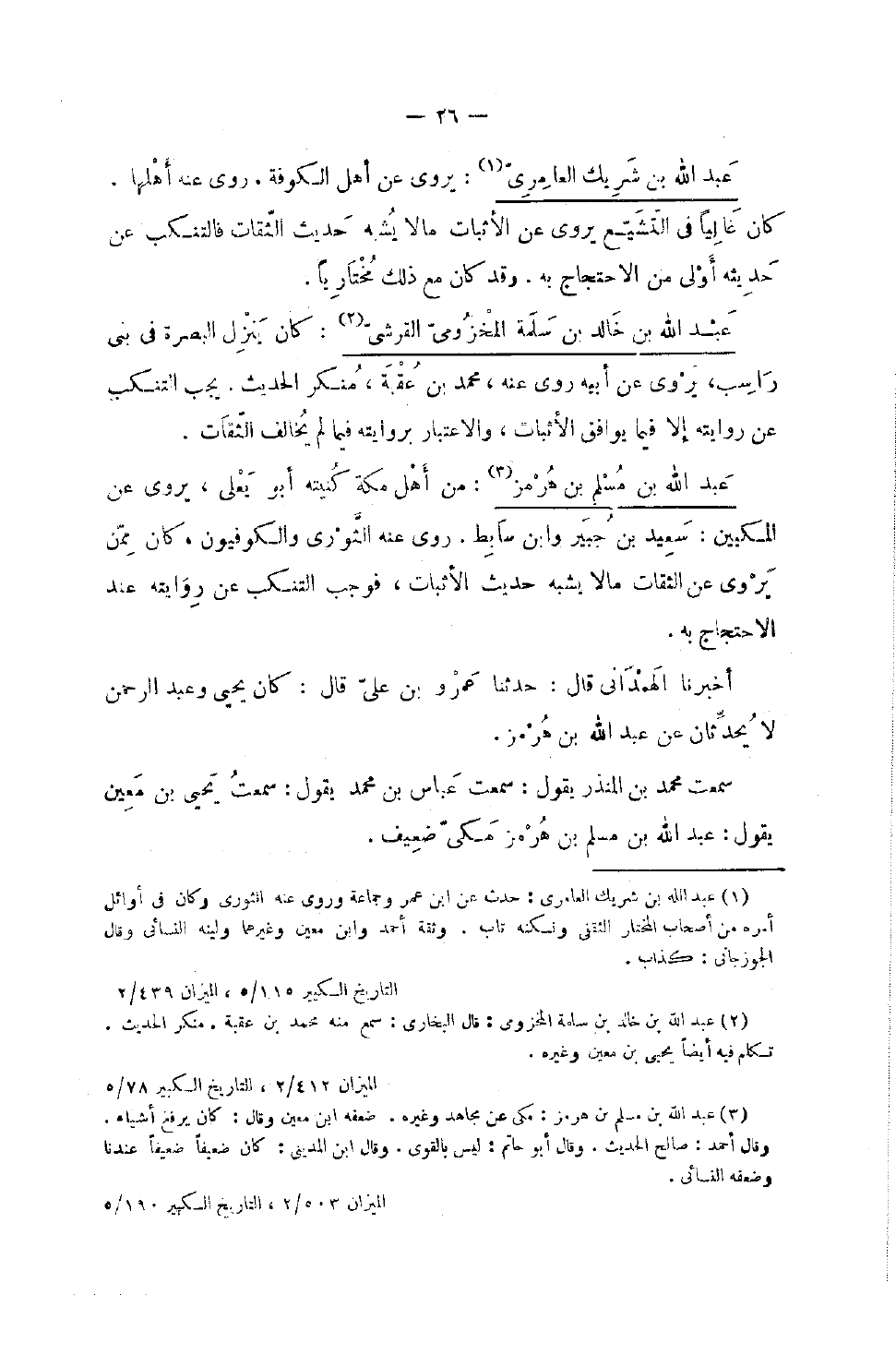 558 - عبد الله بن مُسلم بن هُرْمُز من أهل مَكَّة كنيته أَبُو يعلى يروي عَن المكيين سعيد بن جُبَير وَابْن سابط روى عَنهُ الثَّوْريّ والكوفيون كَانَ مِمَّن يَرْوِي عَن الثِّقَات مَا لَا يشبه حَدِيث الْأَثْبَات فَوَجَبَ التنكب عَن رِوَايَته عِنْد الِاحْتِجَاج بِهِ أَخْبَرَنَا الْهَمْدَانِيُّ قَالَ حَدَّثَنَا عَمْرُو بْنُ عَلِيٍّ قَالَ كَانَ يَحْيَى وَعَبْدُ الرَّحْمَنِ لَا يُحَدِّثَانِ عَنْ عبد الله بن هُرْمُز سَمِعت مُحَمَّد بن الْمُنْذر يَقُول سَمِعت عَبَّاس بن مُحَمَّد يَقُول سَمِعت يحيى بن معِين يَقُول عبد الله بن مُسلم بن هُرْمُز مكي ضَعِيف