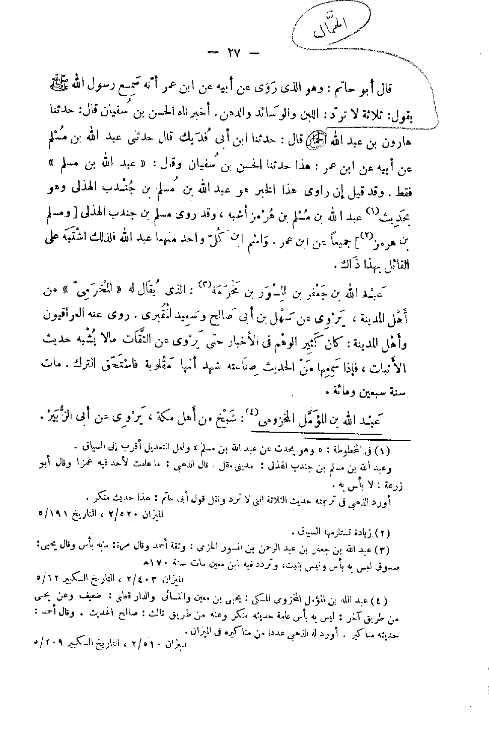 قَالَ أَبُو حَاتِم وَهُوَ الَّذِي روى عَن أَبِيه عَن بن عُمَرَ أَنَّهُ سَمِعَ رَسُولَ اللَّهِ صَلَّى اللَّهُ عَلَيْهِ وَسَلَّمَ يَقُولُ ثَلاثَةٌ لَا تُرَدُّ اللَّبَنُ وَالْوَسَائِدُ وَالدُّهْنُ أَخْبَرَنَاهُ الْحَسَنُ بْنُ سُفْيَانَ قَالَ حَدَّثَنَا هَارُونُ بْنُ عَبْدِ الله الْحمال قَالَ حَدثنَا بن أَبِي فُدَيْكٍ قَالَ حَدَّثَنِي عَبْدُ اللَّهِ بْنُ مُسْلِمٍ عَنْ أَبِيهِ عَن بن عُمَرَ هَذَا حَدَّثَنَا الْحَسَنُ بْنُ سُفْيَانَ وَقَالَ عَبْدُ اللَّهِ بْنُ مُسْلِمٍ فَقَطْ وَقَدْ قِيلَ إِنَّ رَاوِيَ هَذَا الْخَبَرِ هُوَ عَبْدُ اللَّهِ بْنُ مُسْلِمِ بْنِ جُنْدُبٍ الْهُذَلِيُّ وَهُوَ بِحَدِيثِ عَبْدِ اللَّهِ بْنِ مُسْلِمِ بْنِ هُرْمُزَ أَشْبَهُ وَقَدْ رَوَى مُسْلِمُ بْنُ جُنْدُبٍ الْهُذَلِيُّ وَمُسْلِمُ بْنُ هُرْمُزَ جَمِيعًا عَن بن عمر وَاسم بن كُلِّ وَاحِدٍ مِنْهُمَا عَبْدُ اللَّهِ فَلِذَلِكَ اشْتَبَهَ عَلَى الْقَائِلِ بِهَذَا ذَاك عبد الله بن جَعْفَر بن الْمسور بن مخرمَة الَّذِي يُقَال لَهُ المخرمي من أهل الْمَدِينَة يروي عَن سُهَيْل بنأبي صَالح وَسَعِيد المَقْبُري روى عَنهُ الْعِرَاقِيُّونَ وَأهل الْمَدِينَة كَانَ كثير الْوَهم فِي الْأَخْبَار حَتَّى يروي عَن الثِّقَات مَا لَا يشبه حَدِيث الْأَثْبَات فَإِذا سَمعهَا من الحَدِيث صناعته شهد أَنَّهَا مَقْلُوبَة فَاسْتحقَّ التّرْك مَاتَ سنة سبعين وَمِائَة