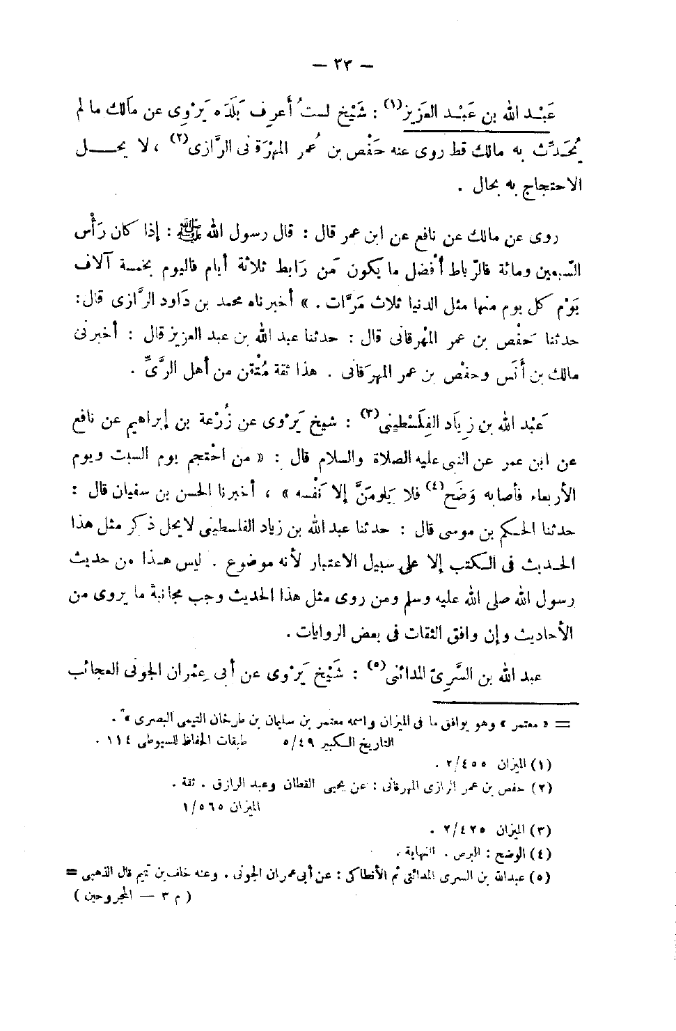 563 - عَبْد اللَّهِ بْن عَبْد الْعَزِيز شيخ لست أعرف بَلَده يروي عَن مَالِك مَا لَمْ يحدث بِهِ مَالك قطّ روى عَنهُ حَفْص بن عمر المهرقاني الرَّازِيّ لَا يحل الِاحْتِجَاج بِهِ بِحَال رَوَى عَنْ مَالِكٍ عَنْ نَافِعٍ عَن بن عُمَر قَالَ قَالَ رَسُول الله صَلَّى اللَّهُ عَلَيْهِ وَسَلَّمَ إِذا كَانَ رَأْسُ السَّبْعِينَ وَمِائَةٍ فَالرِّبَاطُ أَفْضَلُ مَا يَكُونُ مَنْ رَابَطَ ثَلاثَةَ أَيَّامٍ فَالْيَوْمُ بِخَمْسَةِ آلافِ يَوْمٍ كُلُّ يَوْمٍ مِنْهَا مِثْلُ الدُّنْيَا ثَلاثَ مَرَّاتٍ أَخْبَرَنَاهُ مُحَمَّدُ بْنُ دَاوُدَ الرَّازِيُّ قَالَ حَدَّثَنَا حَفْصُ بْنُ عُمَرَ الْمِهْرَقَانِيُّ قَالَ حَدَّثَنَا عَبْدُ اللَّهِ بْنُ عَبْدِ الْعَزِيزِ قَالَ أَخْبَرَنِي مَالِكُ بْنُ أَنَسٍ وَحَفْصُ بْنُ عُمَرَ الْمِهْرَقَانِيُّ هَذَا ثِقَةٌ مُتْقِنٌ مِنْ أَهْلِ الرّيّ