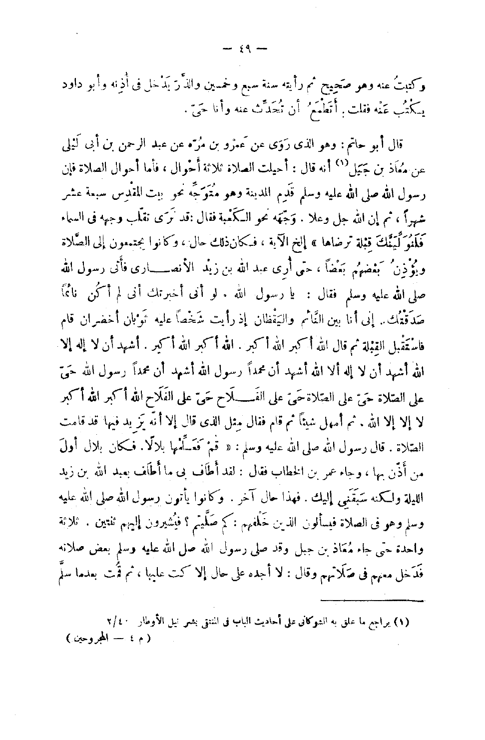 وكتبت عَنهُ وَهُوَ صَحِيح ثمَّ رَأَيْته سنة سبع وَخمسين والذر يدْخل فِي أُذُنه وَأَبُو دَاوُد يكْتب عَنهُ فَقلت أتطمع أَن تحدث عَنهُ وَأَنا حَيّ قَالَ أَبُو حَاتِم وَهُوَ الَّذِي رَوَى عَنْ عَمْرِو بْنِ مُرَّةَ عَنِ عَبْدِ الرَّحْمَنِ بْنِ أَبِي لَيْلَى عَنْ مُعَاذِ بْنِ جَبَلٍ أَنَّهُ قَالَ أُحِيلَتِ الصَّلاةُ ثَلاثَةَ أَحْوَالٍ فَأَمَّا أَحْوَالُ الصَّلاةِ فَإِنَّ رَسُولَ اللَّهِ صَلَّى اللَّهُ عَلَيْهِ وَسَلَّمَ قَدِمَ الْمَدِينَةَ وَهُوَ مُتَوَجِّهٌ نَحْوَ بَيْتِ الْمَقْدِسِ سَبْعَةَ عَشَرَ شَهْرًا ثُمَّ إِنَّ اللَّهَ جَلَّ وَعَلا وَجَّهَهُ نَحْوَ الْكَعْبَةِ فَقَالَ قَدْ نَرَى تَقَلُّبَ وَجْهِكَ فِي السَّمَاءِ فلنولينك قبْلَة ترضاها إِلَخ الْآيَة فَكَانَ ذَلِكَ حَالٌ وَكَانُوا يَجْتَمِعُونَ إِلَى الصَّلاةِ وَيُؤَذِّنُ بَعْضُهُمْ بَعْضًا حَتَّى أَرَى عَبْدَ اللَّهِ بْنَ زَيْدٍ الأَنْصَارِيَّ فَأَتَى رَسُولُ اللَّهِ صَلَّى اللَّهُ عَلَيْهِ وَسَلَّمَ فَقَالَ يَا رَسُولَ اللَّهِ لَوْ أَنِّي أَخْبَرْتُكَ أَنِّي لَمْ أَكُنْ نَائِمًا صَدَقْتُكَ إِنِّي أَنَا بَيْنَ النَّائِمِ وَالْيَقْظَانِ إِذْ رَأَيْتُ شَخْصًا عَلَيْهِ ثَوْبَانِ أَخْضَرَانِ قَامَ فَاسْتَقْبَلَ الْقِبْلَةَ ثُمَّ قَالَ اللَّهُ أكبر الله أكبر الله أكبر اللَّهُ أَكْبَرُ أَشْهَدُ أَنْ لَا إِلَهَ إِلا اللَّهُ أَشْهَدُ أَنْ لَا إِلَهَ إِلا اللَّهُ أَشْهَدُ أَنَّ مُحَمَّدًا رَسُولُ اللَّهِ أَشْهَدُ أَنَّ مُحَمَّدًا رَسُولُ اللَّهِ حَيَّ عَلَى الصَّلاةِ حَيَّ عَلَى الصَّلاةِ حَيَّ عَلَى الْفَلاحِ حَيَّ عَلَى الْفَلاحِ اللَّهُ أَكْبَرُ اللَّهُ أَكْبَرُ لَا إِلَهَ إِلا اللَّهُ ثُمَّ أَمْهَلَ شَيْئًا ثُمَّ قَامَ فَقَالَ مِثْلَ الَّذِي قَالَ إِلا أَنَّهُ يَزِيدُ فِيهَا قَدْ قَامَتِ الصَّلاةُ قَالَ رَسُولُ اللَّهِ صَلَّى اللَّهُ عَلَيْهِ وَسَلَّمَ قُمْ فَعَلِّمْهَا بِلالا فَكَانَ بِلالٌ أَوَّلَ مَنْ أَذَّنَ بِهَا وَجَاءَ عُمَرُ بْنُ الْخَطَّابِ فَقَالَ لَقَدْ أَطَافَ بِي مَا أَطَافَ بِعَبْدِ اللَّهِ بْنِ زَيْدٍ اللَّيْلَةَ وَلَكِنَّهُ سَبَقَنِي إِلَيْكَ فَهَذَا حَالٌ آخَرُ وَكَانُوا يَأْتُونَ رَسُولَ اللَّهِ صَلَّى اللَّهُ عَلَيْهِ وَسَلَّمَ وَهُوَ فِي الصَّلاةِ فَيَسْأَلُونَ الَّذِينَ خَلْفَهُمْ كَمْ صَلَّيْتُمْ فَيُشِيرُونَ إِلَيْهِمْ ثِنْتَيْنِ ثَلاثَةً وَاحِدَةً حَتَّى جَاءَ مُعَاذُ بْنُ جَبَلٍ وَقَدْ صَلَّى رَسُولُ اللَّهِ صَلَّى اللَّهُ عَلَيْهِ وَسَلَّمَ بَعْضَ صَلاتِهِ فَدَخَلَ مَعَهُمْ فِي صَلاتِهِمْ وَقَالَ لَا أَجِدُهُ عَلَى حَالٍ إِلا كُنْتُ عَلَيْهَا ثُمَّ قُمْتُ بَعْدَ مَا سَلَّمَ