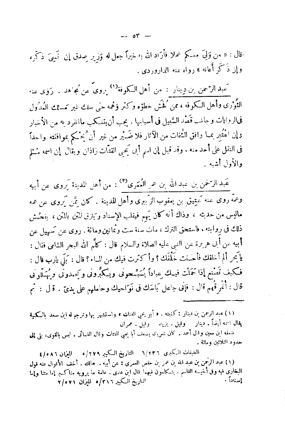 591 - عبد الرَّحْمَن بن عبد الله بن عمر الْعمريّ من أهل الْمَدِينَة يروي عَن أَبِيه وَعَمه روى عَنهُ عَتيق بن يَعْقُوب الزبيرِي وَأهل الْمَدِينَة كَانَ مِمَّن يروي عَن عَمه مَا لَيْسَ من حَدِيثه وَذَاكَ أَنه كَانَ يهم فيقلب الْإِسْنَاد وَيلْزق الْمَتْن بِالْمَتْنِ يفحش ذَلِك فِي رِوَايَته فَاسْتحقَّ التّرْك مَاتَ سنة سِتّ وَثَمَانِينَ وَمِائَة رَوَى عَنْ سُهَيْلٍ عَنْ أَبِيهِ عَنْ أَبِي هُرَيْرَةَ عَنِ النَّبِيِّ صَلَّى اللَّهُ عَلَيْهِ وَسَلَّمَ قَالَ كَلَّمَ اللَّهُ الْبَحْرَ الشَّامِيَّ فَقَالَ يَا بَحْرُ أَلَمْ أَخْلُقْكَ فَأَحْسَنْتُ خَلْقَكَ وَأَكْثَرْتُ فِيكَ مِنَ الْمَاءِ قَالَ بَلَى يَا رَبِّ قَالَ فَكَيْفَ تَصْنَعُ إِذَا حَمَلْتُ فِيكَ عِبَادًا يُسَبِّحُونِي وَيُكَبِّرُونِي وَيَحْمَدُونِي وَيُهَلِّلُونِي قَالَ أُغْرِقُهُمْ قَالَ فَإِنِّي جَاعِلٌ بَأْسَكَ فِي نَوَاحِيكَ وَحَامِلُهُمْ عَلَى يَدِي قَالَ ثُمَّ كَلَّمَ اللَّهُ الْبَحْرَ الْهِنْدِيَّ فَقَالَ يَا بَحْرُ أَلَمْ أَخْلُقْكَ فَأَحْسَنْتُ خَلْقَكَ وَأَكْثَرْتُ فِيكَ مِنَ الْمَاءِ قَالَ بَلَى يَا رَبِّ قَالَ فَكَيْفَ تَصْنَعُ إِذَا حَمَلْتُ فِيكَ عِبَادًا يُسَبِّحُونِي وَيُكَبِّرُونِي وَيُهَلِّلُونِي وَيَحْمَدُونِي قَالَ أُسَبِّحُكَ مَعَهُمْ وَأَحْمَدُكَ وَأُكَبِّرُكَ وَأُهَلِّلُكَ مَعَهُمْ وَأَحْمِلُهُمْ بَيْنَ ظَهْرِي وَبَطْنِي قَالَ فَجَعَلَ اللَّهُ فِيهِ الْحِلْيَةَ وَالصَّيْدَ الطَّيِّبَ أَخْبَرَنَاهُ جَمَاعَةٌ عَنِ الْحَسَنِ بْنِ عَرَفَةَ عَنْ عَبْدِ الرَّحْمَنِ عَبْدِ اللَّهِ بْنِ عُمَرَ وَرَوَى عَبْدُ الرَّحْمَنِ هَذَا عَنْ هِشَامِ بْنِ عُرْوَةَ عَنْ أَبِيهِ عَنْ عَائِشَةَ أَنَّ رَسُولَ اللَّهِ صَلَّى اللَّهُ عَلَيْهِ وَسَلَّمَ قَالَ وَيْلٌ لِلَّذِينَ يَمَسُّونَ فُرُوجَهُمْ ثُمَّ يُصَلُّونَ وَلَا يتوضأون قَالَتْ لَهُ عَائِشَةُ بِأَبِي أَنْتَ وَأُمِّي هَذَا لِلرِّجَالِ فَمَا بَالُ النِّسَاءِ قَالَ إِذَا مَسَّتْ إِحْدَاكُنَّ فرجهَا فلتتوضأأخبرناه بْنِ زُهَيْرٍ بِتُسْتَرَ قَالَ حَدَّثَنَا أَحْمَدُ بْنُ الْوَلِيدِ الْكَرْخِيُّ قَالَ حَدَّثَنَا عَتِيقُ بْنُ يَعْقُوبَ الزُّبَيْرِيُّ قَالَ حَدَّثَنَا عَبْدُ الرَّحْمَنِ بْنُ عَبْدِ اللَّهِ بْنِ عُمَرَ عَنِ هِشَام بن عُرْوَة