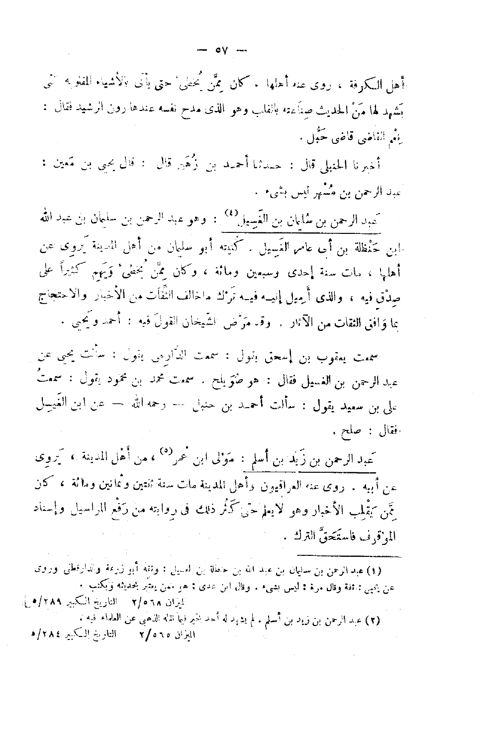 597 - عبد الرَّحْمَن بن سُلَيْمَان بن الغسيل وَهُوَ عبد الرَّحْمَن بْن سُلَيْمَان بْن عَبْد اللَّهِ بن حَنْظَلَة بن أبي عَامر الغسيل كنيته أَو سُلَيْمَان من أهل الْمَدِينَة يروي عَن أَهلهَا مَاتَ سنة إِحْدَى وَسبعين وَمِائَة وَكَانَ مِمَّن يخطء ويهم كثيرا على صدق فِيهِ وَالَّذِي أميل إِلَيْهِ فِيهِ ترك مَا خَالف الثِّقَات من الْأَخْبَار والاحتجاج بِمَا وَافق الثِّقَات من الْآثَار وَقد مرض الشَّيْخَانِ القَوْل فِيهِ أَحْمد وَيحيى سَمِعت يَعْقُوب بْن إِسْحَاق يَقُول سَمِعت الدَّارمِيّ يَقُول سَأَلت يحيى عَن عبد الرَّحْمَن بن الغسيل فَقَالَ هُوَ صُوَيْلِح سَمِعت مُحَمَّد بن مَحْمُود يَقُول سَمِعت عَليّ بن سعيد يَقُول سَأَلت أَحْمد بن حَنْبَل رَحمَه الله عَن بن الغسيل فَقَالَ صلح