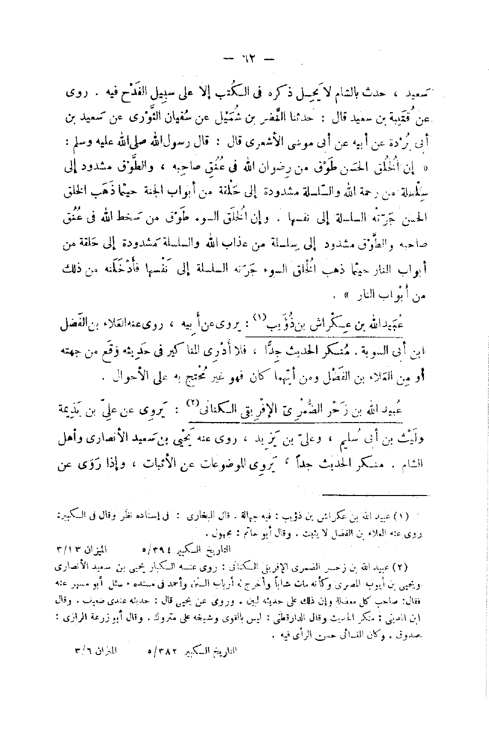 سعيد حدث بِالشَّام لَا يحل ذكره فِي الْكتب إِلَّا عَلَى سَبِيل الْقدح فِيهِ رَوَى عَنْ قيبة بْنِ سَعِيدٍ قَالَ حَدَّثَنَا النَّضْرُ بْنُ شُمَيْلٍ عَنْ سُفْيَانَ الثَّوْرِيِّ عَنْ سَعِيدِ بْنِ أَبِي بُرْدَةَ عَن أَبِيهِ عَنْ أَبِي مُوسَى الأَشْعَرِيِّ قَالَ قَالَ رَسُولُ اللَّهِ صَلَّى اللَّهُ عَلَيْهِ وَسَلَّمَ أَن الْخُلُقَ الْحَسَنَ طَوْقٌ مِنْ رِضْوَانِ اللَّهِ فِي عُنُقِ صَاحِبِهِ وَالطَّوْقُ مَشْدُودٌ إِلَى سِلْسِلَةٍ مِنْ رَحْمَةِ اللَّهِ وَالسِّلْسِلَةُ مَشْدُودَةٌ إِلَى حَلَقَةٍ من أَبْوَاب الحنة حَيْثُمَا ذَهَبَ الْخُلُقُ الْحَسَنُ جَرَّتْهُ السِّلْسِلَةُ إِلَى نَفْسِهَا وَإِنَّ الْخُلُقَ السُّوءَ طَوْقٌ مِنْ سُخْطِ اللَّهِ فِي عُنُقِ صَاحِبِهِ وَالطَّوْقُ مَشْدُودٌ إِلَى سِلْسِلَةٍ مِنْ عَذَابِ اللَّهِ وَالسِّلْسِلَةُ مَشْدُودَةٌ إِلَى حَلَقَةٍ مِنْ أَبْوَابِ النَّارِ حَيْثُمَا ذَهَبَ الْخُلُقُ السُّوءُ جَرَّتْهُ السِّلْسِلَةُ إِلَى نَفْسِهَا فَأَدْخَلَتْهُ مِنْ ذَلِكَ مِنْ أَبْوَابِ النَّارِ