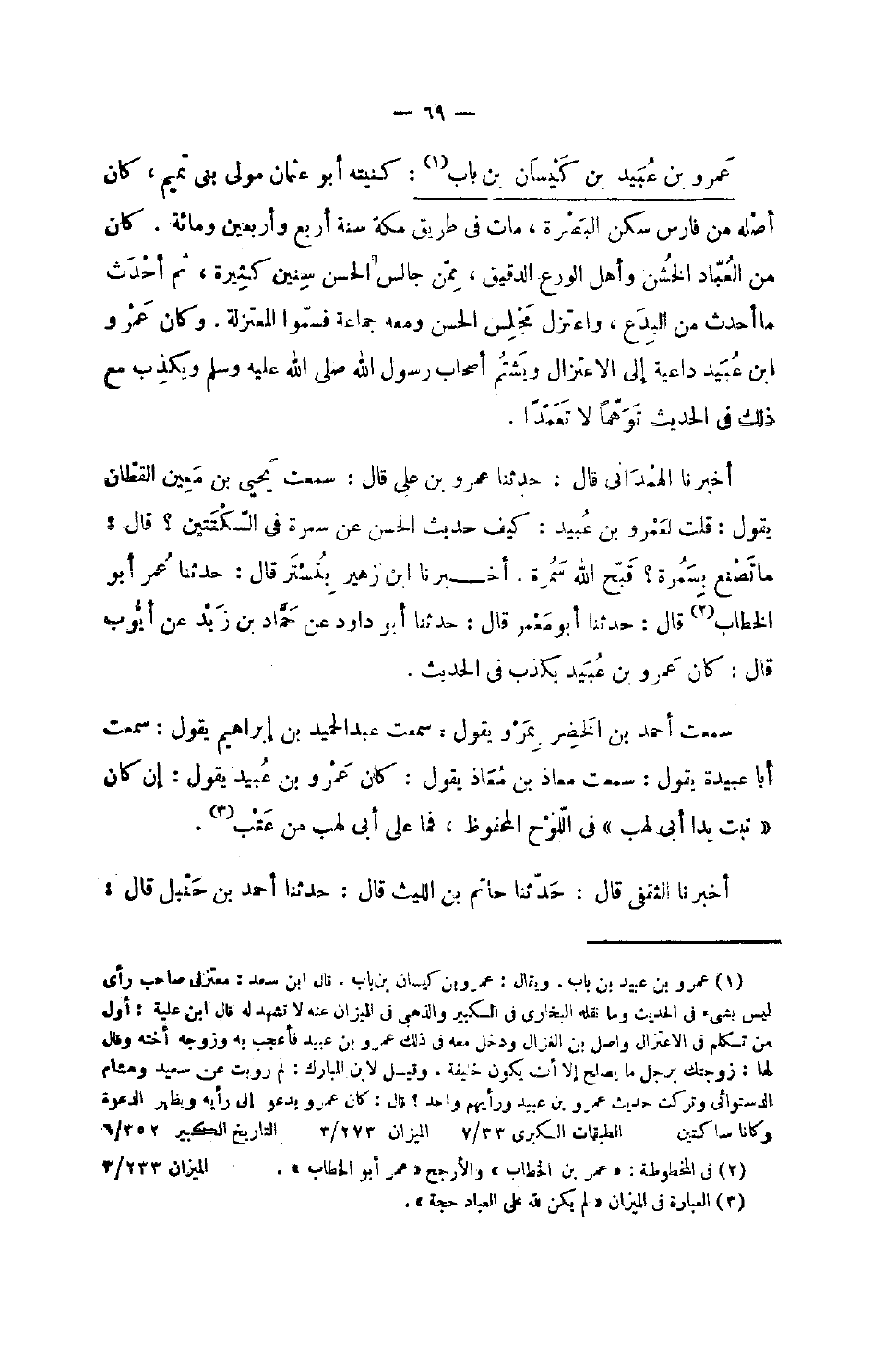 619 - عَمْرو بن عبيد بن كيسَان بن بَاب كنيته أَبُو عُثْمَان مولى بني تَمِيم كَانَ أَصله من فَارس سكن الْبَصْرَة مَاتَ فِي طَرِيق مَكَّة سنة أَربع وَأَرْبَعين وَمِائَة كَانَ من الْعباد الخشن وَأهل الْوَرع الدَّقِيق مِمَّن جَالس الْحسن سِنِين كَثِيرَة ثمَّ أحدث مَا أحدث من الْبدع وَاعْتَزل مجْلِس الْحسن وَمَعَهُ جمَاعَة فَسَموهُ الْمُعْتَزلَة وَكَانَ عَمْرو بن عبيد دَاعِيَة إِلَى الاعتزال يشْتم أصَاب رَسُولُ اللَّهِ صَلَّى اللَّهُ عَلَيْهِ وَسَلَّمَ ويكذب مَعَ ذَلِك فِي الحَدِيث توهما لَا تعمدا أخبرنَا الْهَمدَانِي قَالَ حَدثنَا عَمْرو بن عَليّ قَالَ سَمِعت يحيى بن سعيد الْقطَّان يَقُول قلت لعَمْرو بن عبيد كَيفَ حَدِيث الْحسن عَن سَمُرَة فِي السكتتين قَالَ مَا نصْنَع بسمرة قبح الله سَمُرَة أخبرنَا بْنِ زُهَيْرٍ بِتُسْتَرَ قَالَ حَدَّثَنَا عمر أَبُو الْخطاب قَالَ حَدثنَا أَبُو معمر قَالَ حَدثنَا أَبُو دَاوُد عَن حَمَّاد بن زيد عَن أَيُّوب قَالَ كَانَ عَمْرو بن عبيد يكذب فِي الحَدِيث سَمِعت أَحْمد بن الْخضر بمرو يَقُول سَمِعت عبد الحميد بن إِبْرَاهِيم يَقُول سَمِعت أَبَا عُبَيْدَة يَقُول سَمِعت معَاذ بن معَاذ يَقُول كَانَ عَمْرو بن عبيد يَقُول إِن كَانَ تَبَّتْ يَدَا أَبِي لَهَبٍ فِي اللَّوْح الْمَحْفُوظ فَمَا على أبي لَهب عتب أخبرنَا الثَّقَفِيّ قَالَ حَدثنَا حَاتِم بن اللَّيْث قَالَ حَدثنَا أَحْمد بن حَنْبَل قَالَ