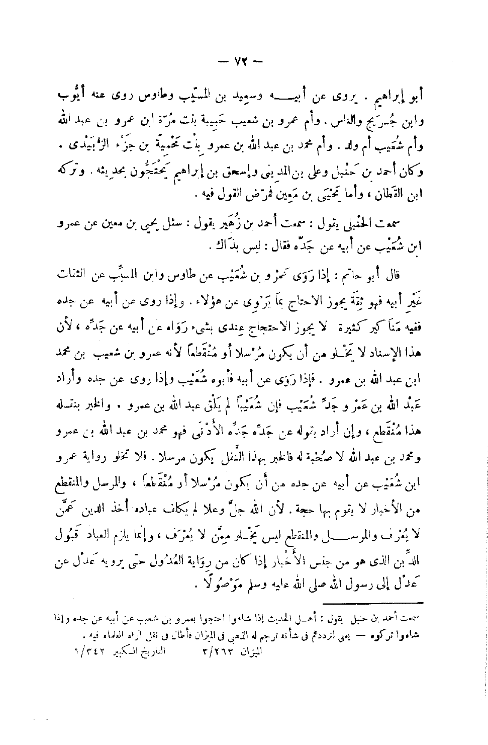 أَبُو إِبْرَاهِيم يروي عَن أَبِيه وَسَعِيد بن الْمسيب وَطَاوُس روى عَنهُ أَيُّوب وَابْن جريج وَالنَّاس وَأم عَمْرو بن شُعَيْب حَبِيبَة بنت مرّة بن عَمْرو بن عبد الله وَأم شُعَيْب أم ولد وَأم مُحَمَّد بن عبد الله بن عَمْرو بنت محمية بن جُزْء الزبيدِيّ وَكَانَ أَحْمد بن حَنْبَل وَعلي بن الْمَدِينِيّ وَإِسْحَاق بن إِبْرَاهِيم يحتجون بحَديثه وَتَركه بن الْقطَّان وَأما يحيى بن معِين فَمَرض القَوْل فِيهِ سَمِعت الْحَنْبَلِيّ يَقُول أَحْمَد بْن زُهَيْر يَقُول سُئِلَ يحيى بن معِين عَن عَمْرو بْنِ شُعَيْبٍ عَنْ أَبِيهِ عَنْ جده فَقَالَ لَيْسَ بِذَاكَ قَالَ أَبُو حَاتِم إِذا روى عَمْرو بن شُعَيْب عَن طَاوس وَابْن الْمسيب عَن الثِّقَات غير أَبِيه فَهُوَ ثِقَة يجوز الِاحْتِجَاج بِمَا يروي عَن هَؤُلَاءِ وَإِذا روى عَن أَبِيه عَن جده فَفِيهِ مَنَاكِير كثية لَا يجوز الِاحْتِجَاج عِنْدِي بِشَيْء رَوَاهُ عَن أَبِيه عَن جده لِأَن هَذَا الْإِسْنَاد لَا يَخْلُو من أَن يكون مُرْسلا أَو مُنْقَطع لِأَنَّهُ عَمْرو بن شُعَيْب بن مُحَمَّد بن عبد الله بن عَمْرو فَإِذا روى عَن أَبِيه فأبوه شُعَيْب وَإِذا روى عَن جده وَأَرَادَ عبد الله بن عَمْرو وجد شُعَيْب فَإِن شعيبا لم يلق عبد الله بن عَمْرو وَالْخَبَر بنقله هَذَا مُنْقَطع وَإِن أَرَادَ بقوله عَن جده جده الْأَدْنَى فَهُوَ مُحَمَّد بن عبد الله بن عَمْرو وَمُحَمّد بن عبد الله لَا صُحْبَة لَهُ فَالْخَبَر بِهَذَا النَّقْل يكون مُرْسلا فَلَا تخلوا رِوَايَة عَمْرو بْنِ شُعَيْبٍ عَنْ أَبِيهِ عَنْ جده من أَن يكون مُرْسلا أَو مُنْقَطِعًا والمرسل والمنقطع من الْأَخْبَار لَا يقوم بهَا حجَّة لِأَن الله جلّ وَعلا لم يُكَلف عباد أَخذ الدَّين عَمَّن لَا يعرف والمرسل والمنقطع لَيْسَ يخلوا مِمَّن لَا يعرف وَإِنَّمَا يلْزم الْعباد قبُول الدَّين الَّذِي هُوَ من جنس الْأَخْبَار إِذا كَانَ من رِوَايَة الْعُدُول حَتَّى يرويهِ عدل عَن عدل إِلَى رَسُول الله صَلَّى اللَّهُ عَلَيْهِ وَسَلَّمَ مَوْصُولا