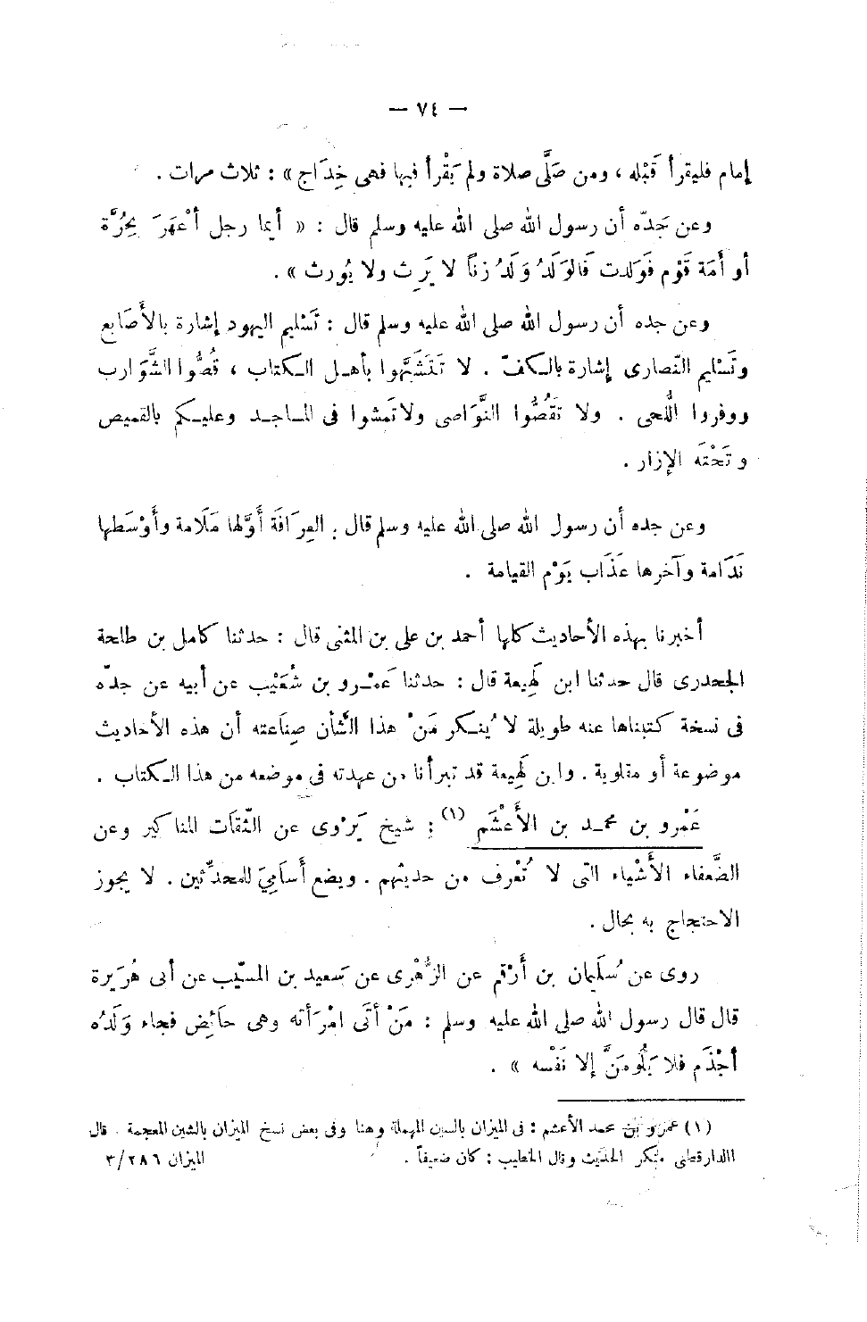 إِمَامٍ فَلْيَقْرَأْ قَبْلَهُ وَمَنْ صَلَّى صَلاةً وَلَمْ يَقْرَأْ فِيهَا فَهِيَ خِدَاجٌ ثَلاثَ مَرَّاتٍ وَعَنْ جَدِّهِ أَنَّ رَسُولَ اللَّهِ صَلَّى اللَّهُ عَلَيْهِ وَسَلَّمَ قَالَ أَيُّمَا رَجُلٍ أَعْهَرَ بِحُرَّةٍ أَوْ أَمَةِ قَوْمٍ فَوَلَدَتْ فَالْوَلَدُ وَلَدُ زِنًا لَا يَرِثُ وَلا يُورَثُ وَعَنْ جَدِّهِ أَنَّ رَسُولَ اللَّهِ صَلَّى اللَّهُ عَلَيْهِ وَسَلَّمَ قَالَ تَسْلِيمُ الْيَهُودِ إِشَارَة بالأصباع وَتَسْلِيمُ النَّصَارَى إِشَارَةٌ بِالْكَفِّ لَا تَتَشَبَّهُوا بِأَهْلِ الْكِتَابِ قُصُّوا الشَّوَارِبِ وَوَفِّرُوا اللِّحَى وَلا تَقُصُّوا النَّوَاصِيَ وَلا تَمْشُوا فِي الْمَسَاجِدِ وَعَلَيْكُمْ بِالْقَمِيصِ وَتَحْتَهُ الإِزَارُ وَعَنْ جَدِّهِ أَنَّ رَسُولَ اللَّهِ صَلَّى اللَّهُ عَلَيْهِ وَسَلَّمَ قَالَ الْعِرَافَةُ أَوَّلُهَا مَلامَةٌ وَأَوْسَطُهَا نَدَامَةٌ وَآخِرُهَا عَذَابٌ يَوْمَ الْقِيَامَةِ أَخْبَرَنَا بِهَذِهِ الأَحَادِيثِ كُلِّهَا أَحْمَدُ بْنُ عَلِيِّ بْنِ الْمُثَنَّى قَالَ حَدَّثَنَا كَامِلُ بْنُ طَلْحَة الجحدري قَالَ حَدثنَا بن لَهِيعَةَ قَالَ حَدَّثَنَا عَمْرُو بْنُ شُعَيْبٍ عَنْ أَبِيهِ عَنْ جَدِّهِ فِي نُسْخَةٍ كَتَبْنَاهَا عَنْهُ طَوِيلَةٍ لَا يُنْكِرُ مَنْ هَذَا الشَّأْنُ صِنَاعَتُهُ أَنَّ هَذِهِ الأَحَادِيثَ مَوْضُوعَةٌ أَوْ مَقْلُوبَةٌ وَابْنُ لَهِيعَةَ قَدْ تبرأنا من عهدته فِي مضوعه من هَذَا الْكتاب