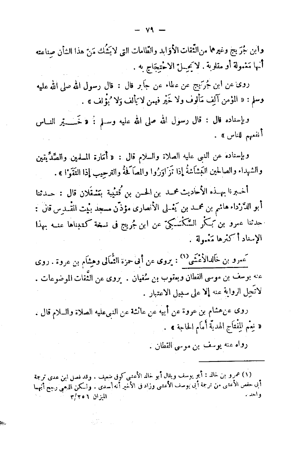 وَابْن جريج وَغَيرهمَا من الثِّقَات الأوابد والطامات الَّتِي لَا يشك من هَذَا الشَّأْن صناعته أَنَّهَا معمولة أَو مَقْلُوبَة لَا يحل الِاحْتِجَاج بِهِ روى عَن بن جُرَيْجٍ عَنْ عَطَاءٍ عَنْ جَابِرِ قَالَ قَالَ رَسُولُ اللَّهِ صَلَّى اللَّهُ عَلَيْهِ وَسَلَّمَ الْمُؤْمِنُ أَلِفٌ مَأْلُوفٌ وَلا خَيْرَ فِيمَنْ لَا يَأْلَفُ وَلا يُؤْلَفُ وَبِإِسْنَادِهِ قَالَ قَالَ رَسُولُ اللَّهِ صَلَّى اللَّهُ عَلَيْهِ وَسَلَّمَ خَيْرُ النَّاسِ أَنْفَعُهُمْ للنَّاس وَبِإِسْنَادِهِ عَنِ النَّبِيِّ صَلَّى اللَّهُ عَلَيْهِ وَسلم قَالَ أَمَارَةُ الْمُسْلِمِينَ وَالصِّدِّيقِينَ وَالشُّهَدَاءِ وَالصَّالِحِينَ الْبَشَاشَةُ إِذَا تَزَاوَرُوا وَالْمُصَافَحَةُ وَالتَّرْحِيبُ إِذَا الْتَقَوْا أَخْبَرَنَا بِهَذِهِ الأَحَادِيثِ مُحَمَّدُ بْنُ الْحَسَنِ بْنِ قُتَيْبَةَ بِعَسْقَلانَ قَالَ حَدَّثَنَا أَبُو الدَّرْدَاءِ هَاشِمُ بْنُ مُحَمَّدِ بْنِ يَعْلَى الأَنْصَارِيُّ مُؤَذِّنُ مَسْجِدِ بَيْتِ الْمَقْدِسِ قَالَ حَدَّثَنَا عَمْرُو بْنُ بكر السكْسكِي عَن بن جُرَيْجٍ فِي نُسْخَةٍ كَتَبْنَاهَا عَنْهُ بِهَذَا الْإِسْنَاد أَكْثَرهَا معمولة
