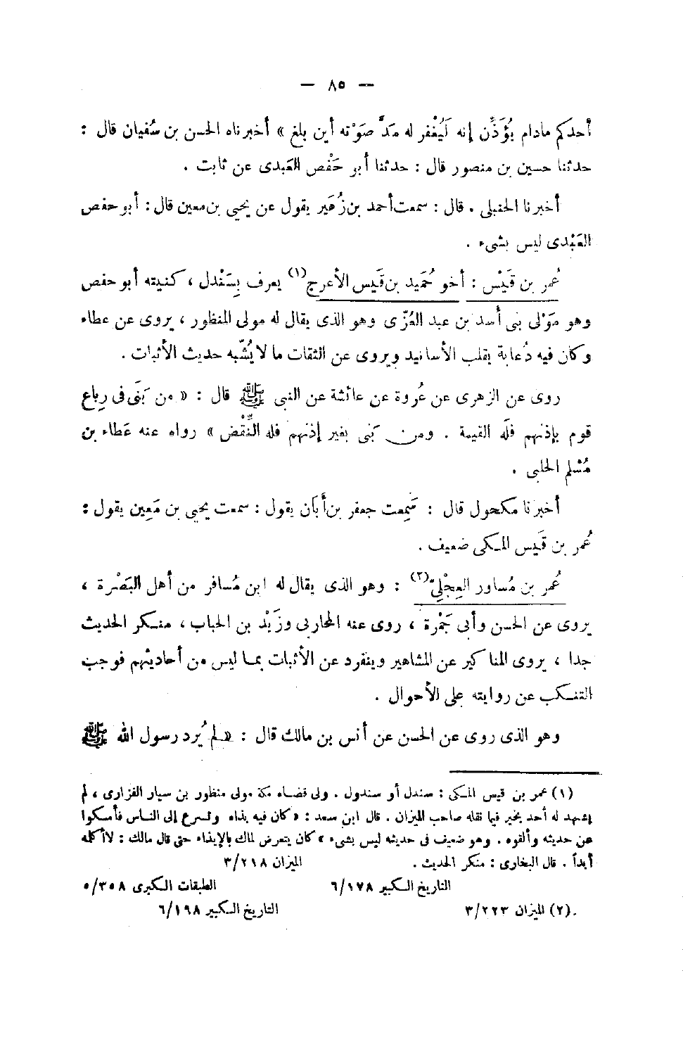 أَحَدِكُمْ مَا دَامَ يُؤَذِّنُ إِنَّهُ لَيَغْفِرُ لَهُ مَدَّ صَوْتِهِ أَيْنَ بَلَغَ أَخْبَرَنَاهُ الْحَسَنُ بْنُ سُفْيَانَ قَالَ حَدَّثَنَا حُسَيْنُ بْنُ مَنْصُورٍ قَالَ حَدَّثَنَا أَبُو حَفْصٍ الْعَبْدِيُّ عَنْ ثَابِتٍ أَخْبَرَنَا الْحَنْبَلِيُّ قَالَ سَمِعت أَحْمَد بْن زُهَيْر يَقُول عَن يحيى بن معِين قَالَ أَبُو حَفْصٍ الْعَبْدِيُّ لَيْسَ بِشَيْءٍ