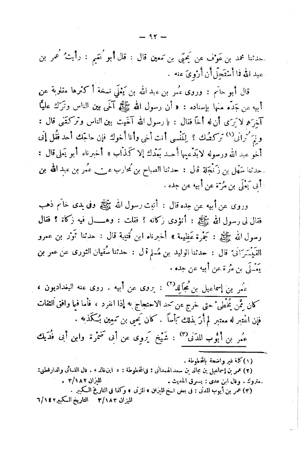مُحَمَّد بن عَوْف عَن يحيى بن معِين قَالَ قَالَ أَبُو نعيم رَأَيْت عمر بن عبد الله فَمَا أستحل أَن أروي عَنهُ قَالَ أَبُو حَاتِم وروى عمر بن عبد الله بن يعلى نُسْخَة أَكْثَرهَا مَقْلُوبَة عَن أَبِيه عَن جده مِنْهَا بِإِسْنَادِهِ أَنَّ رَسُولَ اللَّهِ صَلَّى اللَّهُ عَلَيْهِ وَسَلَّمَ آخَى بَيْنَ النَّاسِ وَترك عليا آخِرهم لَا يعرى أَنَّ لَهُ أَخًا فَقَالَ يَا رَسُولَ اللَّهِ آخَيْتَ بَيْنَ النَّاسِ وَتَرَكْتَنِي قَالَ وَلِمَ تَرَانِي تَرَكْتُكَ لِنَفْسِي أَنْتَ أَخِي وَأَنَا أَخُوكَ فَإِنْ حَاجَّكَ أَحَدٌ فَقُلْ إِنِّي أَخُو عَبْدِ اللَّهِ وَرَسُولِهِ لَا يَدَّعِيهَا أَحَدٌ بَعْدَكَ إِلا كَذَّابٌ أَخْبَرَنَاهُ أَبُو يَعْلَى قَالَ حَدَّثَنَا سَهْلُ بْنُ زَنْجَلَةَ قَالَ حَدَّثَنَا الصَّبَّاحُ بْنُ مُحَارِبٍ عَنْ عُمَرَ بن عبد الله بن أبي يَعْلَى بْنِ مُرَّةَ عَنْ أَبِيهِ عَنْ جَدِّهِ وَرَوَى عَنْ أَبِيهِ عَنْ جَدِّهِ قَالَ أَتَيْتُ رَسُولَ اللَّهِ صَلَّى اللَّهُ عَلَيْهِ وَسَلَّمَ وَفِي يَدِي خَاتَمُ ذَهَبٍ فَقَالَ لِي رَسُولُ اللَّهِ صَلَّى اللَّهُ عَلَيْهِ وَسَلَّمَ أَتُؤَدِّي زَكَاتَهُ فَقُلْتُ وَهَلْ فِيهِ زَكَاةٌ فَقَالَ رَسُولُ اللَّهِ صَلَّى اللَّهُ عَلَيْهِ وَسَلَّمَ جَمْرَة عَظِيمَة أخبرناه بن قُتَيْبَةَ قَالَ حَدَّثَنَا ثَوْرُ بْنُ عَمْرٍو الْقَيْسَرَانِيُّ قَالَ حَدَّثَنَا الْوَلِيدُ بْنُ مُسْلِمٍ قَالَ حَدَّثَنَا سُفْيَانُ الثَّوْريّ عَن عَمْرو بْنِ يَعْلَى بْنِ مُرَّةَ عَنْ أَبِيه عَن جده