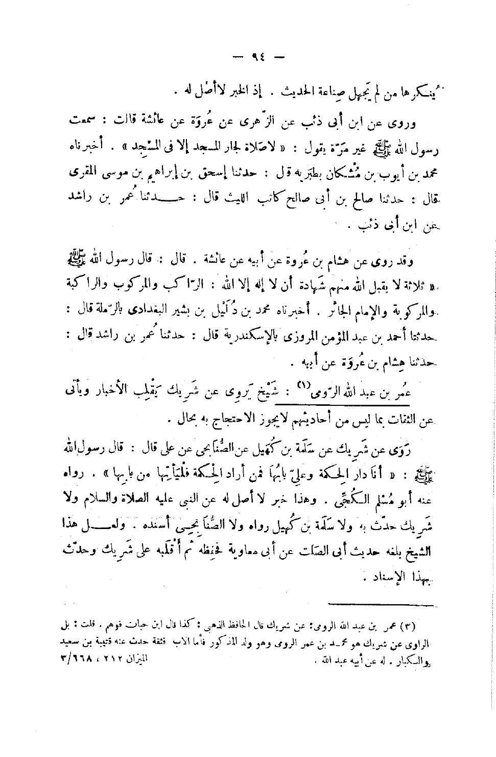 يُنْكِرُهَا مَنْ لَمْ يَجْهَلْ صِنَاعَةَ الْحَدِيثِ إِذِ الْخَبَرُ لَا أَصْلَ لَهُ وروى عَن بن أَبِي ذِئْبٍ عَنِ الزُّهْرِيِّ عَنْ عُرْوَةَ عَنْ عَائِشَةَ قَالَتْ سَمِعْتُ رَسُولُ اللَّهِ صَلَّى اللَّهُ عَلَيْهِ وَسَلَّمَ غَيْرَ مَرَّةٍ يَقُولُ لَا صَلاةَ لِجَارِ الْمَسْجِدِ إِلا فِي الْمَسْجِدِ أَخْبَرَنَاهُ مُحَمَّدُ بْنُ أَيُّوبَ بْنِ مُشْكَانَ بِطَبَرِيَّةَ قَالَ حَدَّثَنَا إِسْحَاقُ بْنُ إِبْرَاهِيمَ بْنِ مُوسَى الْمقري قَالَ حَدَّثَنَا صَالِحُ بْنُ أَبِي صَالِحٍ كَاتِبُ اللَّيْثِ قَالَ حَدَّثَنَا عُمَرُ بْنُ رَاشِدٍ عَنِ بن أَبِي ذِئْبٍ وَقَدْ رَوَى عَنْ هِشَامِ بْنِ عُرْوَةَ عَنْ أَبِيهِ عَنْ عَائِشَةَ قَالَ قَالَ رَسُولُ اللَّهِ صَلَّى اللَّهُ عَلَيْهِ وَسَلَّمَ ثَلاثَةٌ لَا يَقْبَلُ اللَّهُ مِنْهُمْ شَهَادَةَ أَنْ لَا إِلَهَ إِلا اللَّهُ الرَّاكِبُ وَالْمَرْكُوبُ وَالرَّاكِبَةُ وَالْمَرْكُوبَةُ وَالإِمَامُ الْجَائِرُ أَخْبَرَنَاهُ مُحَمَّدُ بْنُ دُلَيْلِ بْنِ بَشِيرٍ الْبَغْدَادِيُّ بِالرَّمْلَةِ قَالَ حَدثنَا أَحْمد بن عبد الْمُؤْمِنِ الْمَرْوَزِيُّ بِالإِسْكَنْدَرِيَّةِ قَالَ حَدَّثَنَا عُمَرُ بْنُ رَاشِدٍ قَالَ حَدَّثَنَا هِشَامِ بْنِ عُرْوَةَ عَنْ أَبِيهِ