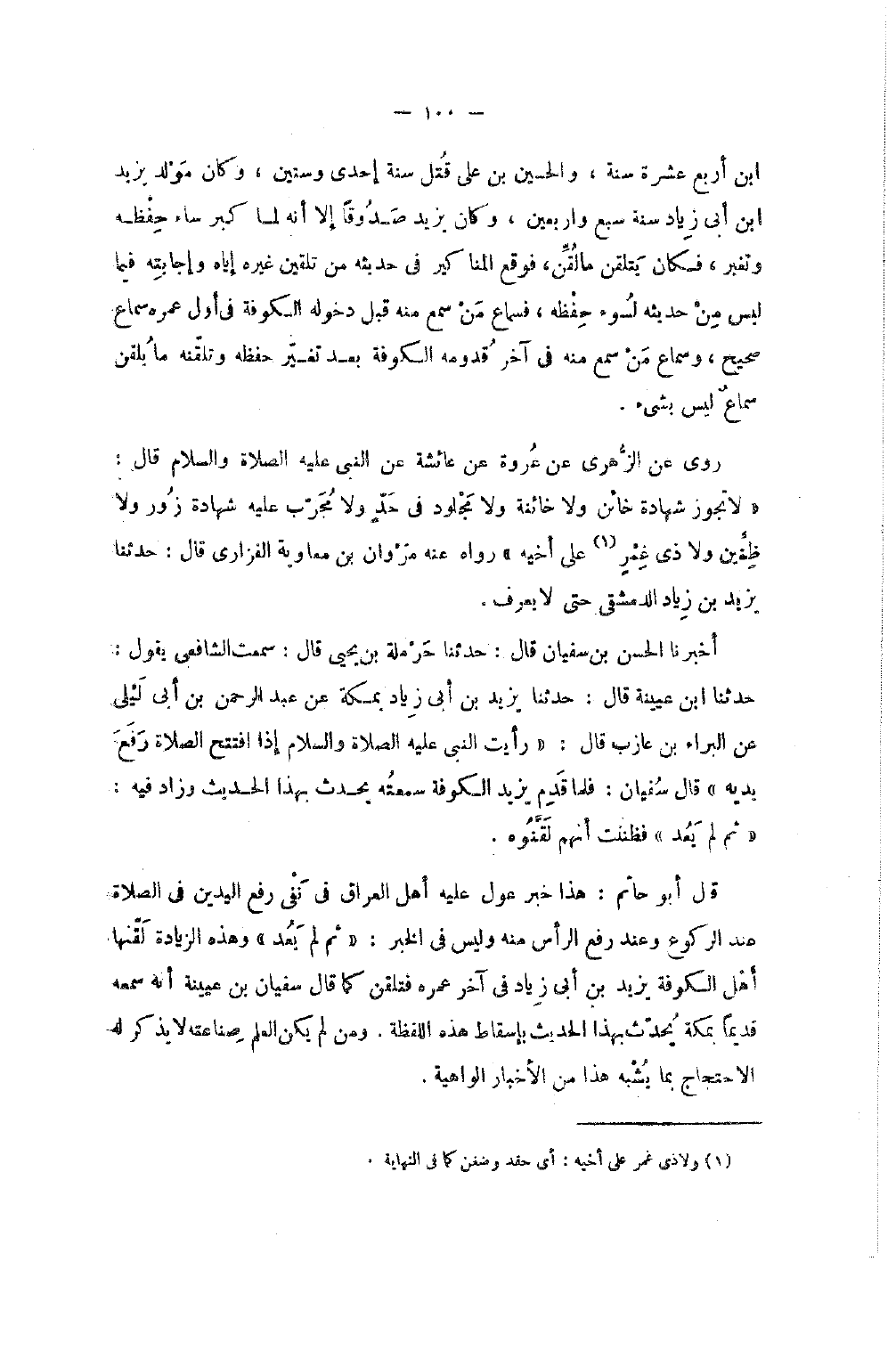 بن أَربع عشرَة سنة وَالْحُسَيْن بن عَليّ قتل سنة إِحْدَى وَسِتِّينَ وَكَانَ مولد يزِيد بن أبي زِيَاد سنة سبع أَرْبَعِينَ وَكَانَ يزِيد صَدُوقًا إِلَّا أَنه لما كبر سَاءَ حفظه وَتغَير فَكَانَ يَتَلَقَّن مَا لقن فَوَقع الْمَنَاكِير فِي حَدِيثه من تلقين غَيره إِيَّاه وإجابته فِيمَا لَيْسَ من حَدِيثه لسوء حفظه فسماع من سمع مِنْهُ قبل دُخُوله الْكُوفَة فِي أول عمره سَماع صَحِيح وَسَمَاع من سمع مِنْهُ فِي آخر قدومه الْكُوفَة بعد تغير حفظه وتلقنه مَا يلقن سَماع لَيْسَ بِشَيْء رَوَى عَنِ الزُّهْرِيِّ عَنْ عُرْوَةَ عَنْ عَائِشَةَ عَن النَّبِي صَلَّى اللَّهُ عَلَيْهِ وَسلم قَالَ لَا تَجُوزُ شَهَادَةُ خَائِنٍ وَلا خَائِنَةٍ وَلا مَجْلُودٍ فِي حَدٍّ وَلا مُجَرَّبٍ عَلَيْهِ شَهَادَةُ زُورٍ وَلا ظِنِّينٍ وَلا ذِي غِمْرٍ عَلَى أَخِيهِ رَوَاهُ عَنْهُ مَرْوَانُ بْنُ مُعَاوِيَةَ الْفَزَارِيُّ قَالَ حَدَّثَنَا يَزِيدُ بْنُ زِيَادٍ الدِّمَشْقِيُّ حَتَّى لَا يُعْرَفُ أَخْبَرَنَا الْحَسَنُ بْنُ سُفْيَانَ قَالَ حَدَّثَنَا حَرْمَلَةُ بْنَ يَحْيَى قَالَ سَمِعْتُ الشَّافِعِيَّ يَقُول حَدثنَا بن عُيَيْنَةَ قَالَ حَدَّثَنَا يَزِيدُ بْنُ أَبِي زِيَادٍ بِمَكَّةَ عَنْ عَبْدِ الرَّحْمَنِ بْنِ أَبِي لَيْلَى عَنْ الْبَرَاءِ بْنِ عَازِبٍ قَالَ رَأَيْتُ النَّبِي صَلَّى اللَّهُ عَلَيْهِ وَسَلَّمَ إِذَا افْتَتَحَ الصَّلاةَ رَفَعَ يَدَيْهِ قَالَ سُفْيَانُ فَلَمَّا قَدِمَ يَزِيدُ الْكُوفَةَ سَمِعْتُهُ يُحَدِّثُ بِهَذَا الْحَدِيثِ وَزَادَ فِيهِ ثُمَّ لَمْ يَعد فَظَنَنْتُ أَنَّهُمْ لَقَّنُوهُ قَالَ أَبُو حَاتِم هَذَا خبر عول عَلَيْهِ أهل الْعرَاق فِي نفي رفع الْيَدَيْنِ فِي الصَّلَاة عِنْدَ الرُّكُوع وَعند رفع الرَّأْس مِنْهُ وَلَيْسَ فِي الْخَبَر ثمَّ لم يعد وَهَذِه الزِّيَادَة لقنها أهل الْكُوفَة يزِيد بن أبي زِيَاد فِي آخر عمره فتلقن كَمَا قَالَ سُفْيَان بن عُيَيْنَة أَنه سَمعه قَدِيما بِمَكَّة يحدث بِهَذَا الحَدِيث بِإِسْقَاط هَذِه اللَّفْظَة وَمن لم يكن الْعلم صناعته لَا يذكر لَهُ الِاحْتِجَاج بِمَا يشبه هَذَا من الْأَخْبَار الْوَاهِيَة
