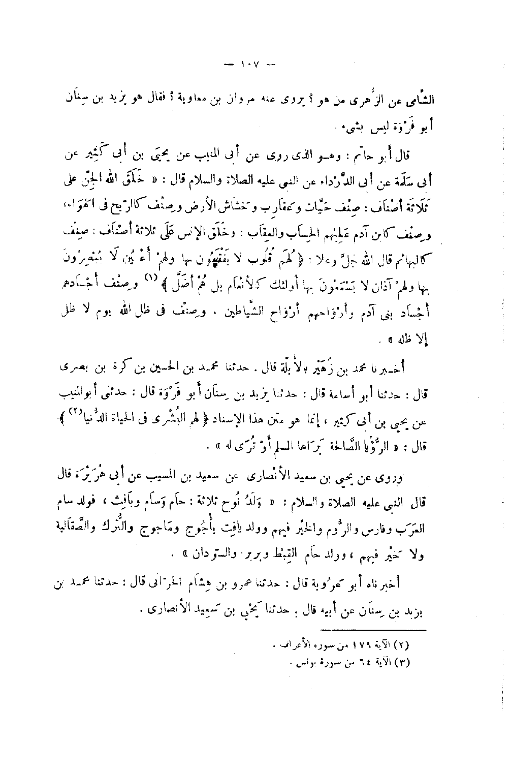 الشَّامِيِّ عَنِ الزُّهْرِيِّ مَنْ هُوَ يَرْوِي عَنْهُ مَرْوَان بْن مُعَاوِيَة فَقَالَ هُوَ يَزِيدُ بْنُ سِنَانٍ أَبُو فَرْوَةَ لَيْسَ بِشَيْءٍ قَالَ أَبُو حَاتِم وَهُوَ الَّذِي رَوَى عَنْ أَبِي الْمُنِيبِ عَنْ يَحْيَى بْنِ أَبِي كَثِيرٍ عَنْ أَبِي سَلَمَةَ عَنْ أَبِي الدَّرْدَاءِ عَنِ النَّبِي صَلَّى اللَّهُ عَلَيْهِ وَسَلَّمَ قَالَ خَلَقَ اللَّهُ الْجِنَّ عَلَى ثَلاثَةِ أَصْنَافٍ صِنْفٌ حَيَّاتٌ وَعَقَارِبُ وَخَشَاشُ الأَرْضِ وصِنْفٌ كَالرِّيحِ فِي الْهَوَاءِ وَصِنْفٌ كَابْنِ آدَمَ عَلَيْهِمُ الْحِسَابُ وَالْعِقَابُ وَخَلَقَ الإِنْسَ عَلى ثَلاثَةِ أَصْنَافٍ صِنْفٌ كَالْبَهَائِمِ قَالَ الله جلّ وعى لَهُم قولب لَا يَفْقَهُونَ بِهَا وَلَهُمْ أَعْيُنٌ لَا يُبْصِرُونَ بِهَا وَلَهُمْ آذَانٌ لَا يَسْمَعُونَ بِهَا أُولَئِكَ كَالأَنْعَامِ بل هم أضلّ وَصِنْفٌ أَجْسَادُهُمْ أَجْسَادُ بَنِي آدَمَ وَأَرْوَاحُهُمْ أَرْوَاحُ الشَّيَاطِينِ وَصِنْفٌ فِي ظِلِّ اللَّهِ يَوْمَ لَا ظِلَّ إِلا ظِلُّهُ أَخْبَرَنَا مُحَمَّدُ بْنُ زُهَيْرٍ بِالأُبُلَّةِ قَالَ حَدَّثَنَا مُحَمَّدُ بْنُ الْحُسَيْنِ بْنِ كرَةَ بْنِ بَصْرِيٍّ قَالَ حَدَّثَنَا أَبُو أُسَامَةَ قَالَ حَدَّثَنَا يَزِيدُ بْنُ سِنَانٍ أَبُو فَرْوَةَ قَالَ حَدَّثَنِي أَبُو الْمُنِيبِ عَنْ يَحْيَى بْنِ أَبِي كَثِيرٍ إِنَّمَا هُوَ مَتْنُ هَذَا الإِسْنَادِ لَهُمُ الْبُشْرَى فِي الْحَيَاةِ الدُّنْيَا قَالَ الرُّؤْيَا الصَّالِحَةُ يَرَاهَا الْمُسْلِمُ أَوْ تُرَى لَهُ وَرَوَى عَنْ يَحْيَى بْنِ سَعِيدٍ الأَنْصَارِيِّ عَنْ سَعِيدُ بْنُ الْمُسَيِّبِ عَنْ أَبِي هُرَيْرَةَ قَالَ قَالَ النَّبِيُّ صَلَّى الله عَلَيْهِ وَسلم وَلَدُ نُوحٍ ثَلاثَةٌ حَامٌ وَسَامٌ وَيَافِثُ فَوَلَدُ سَامٍ الْعَرَبُ وَفَارِسُ وَالروم وَالْخَيْر فيهم وَولد يافت يَأْجُوجُ وَمَأْجُوجُ وَالتُّرْكُ وَالصَّقَالِيةُ وَلا خَيْرَ فِيهِمْ وَوَلَدُ حَامٍ الْقِبْطُ وَبَرْبَرٌ وَالسُّودَانُ أَخْبَرَنَاهُ أَبُو عَرُوبَةَ قَالَ حَدَّثَنَا عَمْرُو بْنُ هِشَامٍ الْحَرَّانِيُّ قَالَ حَدَّثَنَا مُحَمَّدُ بْنُ يَزِيدَ بْنِ سِنَانٍ عَنْ أَبِيهِ قَالَ حَدَّثَنَا يَحْيَى بْنُ سَعِيدٍ الْأنْصَارِيّ وروى