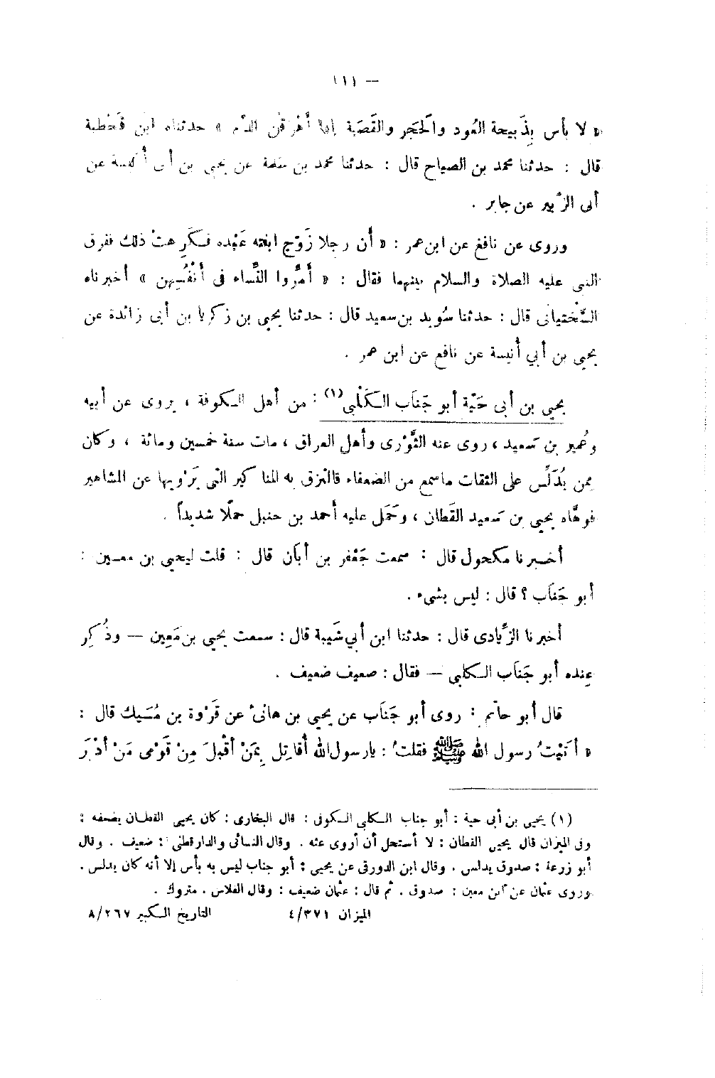 1194 - يحيى بن أبي حَيَّة أَبُو جناب الْكَلْبِيّ من أهل الْكُوفَة يروي عَن أَبِيه وَعُمَيْر بن سعيد روى عَنهُ الثَّوْريّ وَأهل الْعرَاق مَاتَ سنة خمسين وَمِائَة وَكَانَ مِمَّن يُدَلس على الثِّقَات مَا سمع من الضُّعَفَاء فالتزق بِهِ الْمَنَاكِير الَّتِي يَرْوِيهَا عَن الْمَشَاهِير فوهاه يحيى بن سعيد الْقطَّان وَحمل عَلَيْهِ أَحْمد بن حَنْبَل حملا شَدِيدا أَخْبَرَنَا مَكْحُولٌ قَالَ سَمِعت جَعْفَر بن أبان قَالَ قُلْت ليحيى بْن معِين أَبُو جنَابٍ قَالَ لَيْسَ بِشَيْءٍ أَخْبَرَنَا الزيَادي قَالَ حَدثنَا بن أبي شيبَة قَالَ سَمِعت يَحْيَى بْنَ مَعِينٍ وَذُكِرَ عِنْدَهُ أَبُو جنَابٍ الْكَلْبِيُّ فَقَالَ ضَعِيفٌ ضَعِيفٌ قَالَ أَبُو حَاتِم رَوَى أَبُو جَنَابٍ عَنْ يَحْيَى بْنِ هَانِئ عَن قروة بْنِ مُسَيْكٍ قَالَ أَتَيْتُ رَسُولَ اللَّهِ صَلَّى اللَّهُ عَلَيْهِ وَسَلَّمَ فَقُلْتُ يَا رَسُولَ اللَّهِ أُقَاتِلُ بِمَنْ أَقْبَلَ مِنْ قَوْمِي مَنْ أدبر