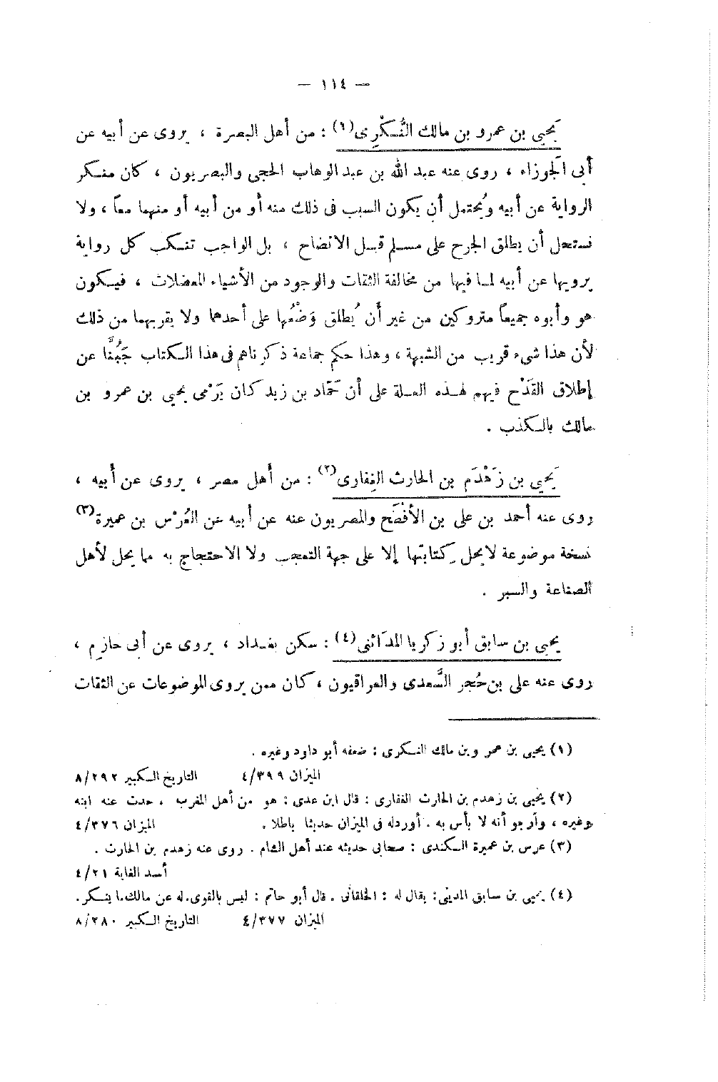 1198 - يحيى بن عَمْرو بن مَالك النكري من أهل الْبَصْرَة يروي عَن أَبِيه عَن أبي الجوزاء روى عَنْهُ عَبْد اللَّهِ بْن عبد الْوَهَّاب الحجي والبصريون كَانَ مُنكر الرِّوَايَة عَن أَبِيه وَيحْتَمل أَن يكون السَّبَب فِي ذَلِك مِنْهُ أَو من أَبِيه أَو مِنْهُمَا مَعًا وَلَا نستحل أَن يُطلق الْجرْح على مُسلم قبل الاتضاح بل الْوَاجِب تنكب كل رِوَايَة يَرْوِيهَا عَن أَبِيه لما فِيهَا من مُخَالفَة الثِّقَات والوجود من الْأَشْيَاء المعضلات فَيكون هُوَ وَأَبوهُ جَمِيعًا متروكين من غير أَن يُطلق وَضعهَا على أَحدهمَا وَلَا يقربهما من ذَلِك لِأَن هَذَا شَيْء قريب من الشُّبْهَة وَهَذَا حكم جمَاعَة ذَكَرْنَاهُمْ فِي هَذَا الْكتاب جبنا عَن إِطْلَاق الْقدح فيهم لهَذِهِ الْعلَّة على أَن حَمَّاد بن زيد كَانَ يَرْمِي يحيى بن عَمْرو بن مَالك بِالْكَذِبِ