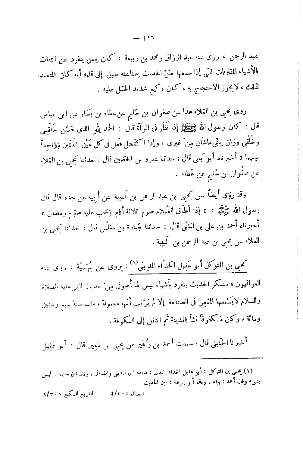 عبد الرَّحْمَن روى عَنهُ عبد الرَّزَّاق وَمُحَمّد بن ربيعَة كَانَ مِمَّن ينْفَرد عَن الثِّقَات بالأشياء المقلوبات الَّتِي إِذا سَمعهَا من الحَدِيث صناعته سبق إِلَى قلبه أَنه كَانَ الْمُعْتَمد لذَلِك لَا يجوز الِاحْتِجَاج بِهِ كَانَ وَكِيع شَدِيد الْحمل عَلَيْهِ رَوَى يَحْيَى بْنُ الْعَلاءِ هَذَا عَنْ صَفْوَانَ بْنَ سُلَيْمٍ عَنْ عَطاء بن يسَار عَن بن عَبَّاسٍ قَالَ كَانَ رَسُولُ اللَّهِ صَلَّى اللَّهُ عَلَيْهِ وَسَلَّمَ إِذا نَظَر فِي الْمِرْآةِ قَالَ الْحَمْدُ لِلَّهِ الَّذِي حَسَّنَ خَلْقِي وَخُلُقِي وَزَانَ مِنِّي مَا شَانَ مِنْ غَيْرِي وَإِذَا اكْتَحَلَ فَعَلَ فِي كُلِّ عَيْنٍ ثِنْتَيْنِ وَوَاحِدًا بَيْنَهُمَا أَخْبَرَنَاهُ أَبُو يَعْلَى قَالَ حَدَّثَنَا عَمْرُو بْنُ الْحُصَيْنِ قَالَ حَدَّثَنَا يَحْيَى بْنُ الْعَلاءِ عَنْ صَفْوَانَ بْنِ سُلَيْمٍ عَنْ عَطَاءٍ وَقَدْ رَوَى أَيْضًا عَنْ يَحْيَى بْنِ عبد الرَّحْمَن بن لَبِيبَةَ عَنْ أَبِيهِ عَنْ جَدِّهِ قَالَ قَالَ رَسُولُ اللَّهِ صَلَّى اللَّهُ عَلَيْهِ وَسَلَّمَ إِذَا أَطَاقَ الْغُلامُ صَوْمَ ثَلاثَةِ أَيَّامٍ وَجَبَ عَلَيْهِ صَوْمُ رَمَضَانَ أَخْبَرَنَاهُ أَحْمَدُ بْنُ عَلِيِّ بْنِ الْمُثَنَّى قَالَ حَدَّثَنَا جُبَارَةُ بْنُ مُغَلِّسٍ قَالَ حَدَّثَنَا يَحْيَى بْنُ الْعَلاءِ عَنْ يَحْيَى بْنِ عَبْدِ الرَّحْمَنِ بْنِ لَبِيبَة