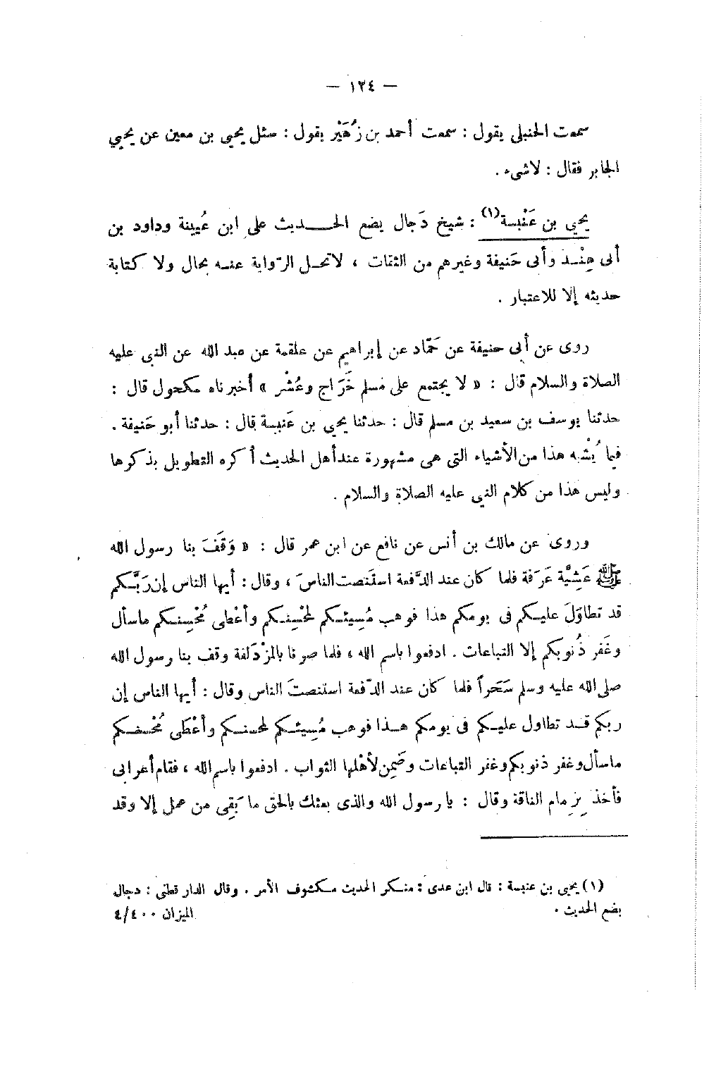 1218 - يحيى بن عَنْبَسَة شيخ دجال يضع الحَدِيث على بن عُيَيْنَة وَدَاوُد بن أبي هِنْد وَأبي حنيفَة وَغَيرهم من الثِّقَات لَا تحل الرِّوَايَة عَنهُ بِحَال وَلَا كِتَابَة حَدِيثه إِلَّا للاعتبار رَوَى عَنْ أَبِي حَنِيفَةَ عَنْ حَمَّادٍ عَنْ إِبْرَاهِيمَ عَنْ عَلْقَمَةَ عَنْ عَبْدِ اللَّهِ عَنِ النَّبِيِّ صَلَّى اللَّهُ عَلَيْهِ وَسَلَّمَ قَالَ لَا يَجْتَمِعُ عَلَى مُسْلِمٍ خَرَاجٌ وَعُشْرٌ أَخْبَرَنَاهُ مَكْحُولٌ قَالَ حَدَّثَنَا يُوسُفُ بْنُ سَعِيدِ بْنِ مُسْلِمٍ قَالَ حَدَّثَنَا يَحْيَى بْنُ عَنْبَسَةَ قَالَ حَدَّثَنَا أَبُو حَنِيفَةَ فِيمَا يُشْبِهُ هَذَا مِنَ الأَشْيَاءِ الَّتِي هِيَ مَشْهُورَةٌ عِنْدَ أَهْلِ الْحَدِيثِ أَكْرَهُ التَّطْوِيلَ بِذِكْرِهَا وَلَيْسَ هَذَا مِنْ كَلامِ النَّبِيِّ صَلَّى اللَّهُ عَلَيْهِ وَسلم وَرَوَى عَنْ مَالِكِ بْنِ أَنَسٍ عَن نَافِع عَن بن عُمَرَ قَالَ وَقَفَ بِنَا رَسُولُ اللَّهِ صَلَّى اللَّهُ عَلَيْهِ وَسَلَّمَ عَشِيَّةَ عَرَفَةَ فَلَمَّا كَانَ عِنْدَ الدَّفْعَةِ اسْتَنْصَتَ النَّاسَ وَقَالَ أَيُّهَا النَّاسُ إِنَّ رَبَّكُمْ قَدْ تَطَاوَلَ عَلَيْكُمْ فِي يَوْمِكُمْ هَذَا فَوَهَبَ مُسِيئَكُمْ لِمُحْسِنِكُمْ وَأَعْطَى مُحْسِنَكُمْ مَا سَأَلَ وَغَفَرَ ذُنُوبَكُمْ إِلا التَّباعات ادْفَعُوا بِاسْمِ اللَّهِ فَلَمَّا صِرْنَا بِالْمُزْدَلِفَةِ وَقَفَ بِنَا رَسُولُ اللَّهِ صَلَّى اللَّهُ عَلَيْهِ وَسَلَّمَ سَحَرًا فَلَمَّا كَانَ عِنْدَ الدَّفْعَةِ اسْتَنْصَتَ النَّاسَ وَقَالَ أَيُّهَا النَّاسُ إِنَّ رَبَّكُمْ قَدْ تَطَاوَلَ عَلَيْكُمْ فِي يَوْمِكُمْ هَذَا فَوَهَبَ مُسِيئَكُمْ لِمُحْسِنِكُمْ وَأَعْطَى مُحْسِنَكُمْ مَا سَأَلَ وَغَفَرَ ذُنُوبَكُمْ وَغَفَرَ التَّبَاعَاتِ وَضَمِنَ لأَهْلِهَا الثَّوَابَ ادْفَعُوا بِاسْمِ اللَّهِ فَقَامَ أَعْرَابِيٌّ فَأَخَذَ بِزِمَامِ النَّاقَةِ وَقَالَ يَا رَسُولَ اللَّهِ وَالَّذِي بَعَثَكَ بِالْحَقِّ مَا بَقِيَ مِنْ عَمَلٍ الا وَقد