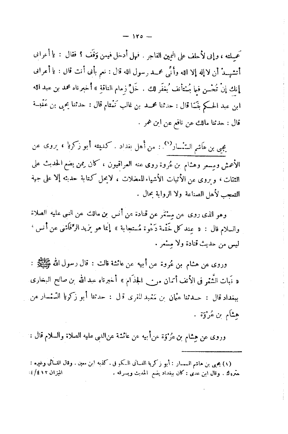 1219 - يحيى بن هَاشم السمسار من أهل بَغْدَاد كنيته أَبُو زَكَرِيَّا يروي عَن الْأَعْمَش ومسعر وَهِشَام بن عُرْوَة روى عَنهُ الْعِرَاقِيُّونَ كَانَ مِمَّن يضع الحَدِيث على الثِّقَات ويروي عَن الْأَثْبَات الْأَشْيَاء المعضلات لَا يحل كِتَابَة حَدِيثه إِلَّا على جِهَة التَّعَجُّب لأهل الصِّنَاعَة وَلَا الرِّوَايَة بِحَال وَهُوَ الَّذِي رَوَى عَنْ مِسْعَرٍ عَنْ قَتَادَةَ عَنْ أَنَسِ بْنِ مَالِكٍ عَنْ النَّبِي صَلَّى اللَّهُ عَلَيْهِ وَسَلَّمَ قَالَ عِنْدَ كُلِّ خَتْمَةٍ دَعْوَةٌ مُسْتَجَابَةٌ إِنَّمَا هُوَ يَزِيدُ الرَّقَاشِيُّ عَنْ أَنَسٍ لَيْسَ مِنْ حَدِيثِ قَتَادَةَ وَلا مِسْعَرٍ وَرَوَى عَنْ هِشَامِ بْنِ عُرْوَةَ عَنْ أَبِيهِ عَنْ عَائِشَةَ قَالَتْ قَالَ رَسُولُ اللَّهِ صَلَّى اللَّهُ عَلَيْهِ وَسَلَّمَ نَبَاتُ الشَّعْرِ فِي الأَنْفِ أَمَانٌ مِنَ الْجُذَامِ أَخْبَرَنَاهُ عَبْدُ اللَّهِ بْنُ صَالِحٍ الْبُخَارِيُّ بِبَغْدَادَ قَالَ حَدثنَا عُثْمَان بن معبد الْمقري قَالَ حَدَّثَنَا أَبُو زَكَرِيَّا السِّمْسَارُ عَنْ هِشَامِ بْنِ عُرْوَةَ وَرَوَى عَنْ هِشَامِ بْنِ عُرْوَةَ عَنْ أَبِيهِ عَنْ عَائِشَةَ عَنِ النَّبِيِّ صَلَّى اللَّهُ عَلَيْهِ وَسَلَّمَ قَالَ