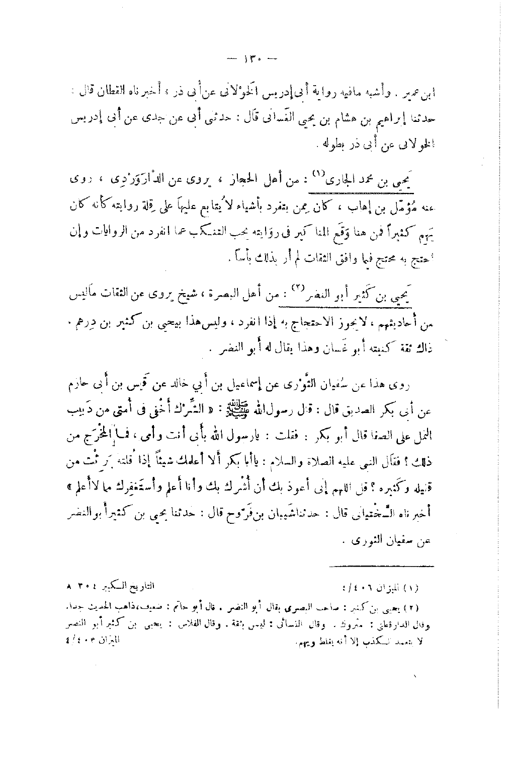 1226 - يحيى بن كثير أَبُو النَّضر من أهل الْبَصْرَة شيخ يروي عَن الثِّقَات مَا لَيْسَ من أَحَادِيثهم لَا يَجُوز الِاحْتِجَاج بِهِ إِذا انْفَرد وَلَيْسَ هَذَا بِيَحْيَى بن كثير بن دِرْهَم ذَاك ثِقَة كنيته أَبُو غَسَّان وَهَذَا يُقَال لَهُ أَبُو النَّضر روى هَذَا عَنْ سُفْيَانَ الثَّوْرِيِّ عَن إِسْمَاعِيل بْن أَبِي خَالِد عَنْ قَيْسِ بْنِ أَبِي حَازِمٍ عَنْ أَبِي بَكْرٍ الصِّدِّيقِ قَالَ قَالَ رَسُولُ اللَّهِ صَلَّى اللَّهُ عَلَيْهِ وَسَلَّمَ الشِّرْكُ أَخْفَى فِي أُمَّتِي مِنْ دَبِيبِ النَّمْلِ عَلَى الصَّفَا قَالَ أَبُو بَكْرٍ فَقُلْتُ يَا رَسُولَ اللَّهِ بِأَبِي أَنْتَ وَأُمِّي فَمَا الْمَخْرَجُ مِنْ ذَلِكَ فَقَالَ النَّبِيُّ صَلَّى اللَّهُ عَلَيْهِ وَسلم يَا أَبَا بَكْرٍ أَلا أُعَلِّمُكَ شَيْئًا إِذَا قُلْتَهُ بَرِئْتَ مِنْ قَلِيلِهِ وَكَثِيرِهِ قُلْ اللَّهُمَّ إِنِّي أَعُوذُ بِكَ أَنْ أُشْرِكَ بِكَ وَأَنَا أَعْلَمُ وَأَسْتَغْفِرُكَ مِمَّا لَا أَعْلَمُ أَخْبَرَنَاهُ السَّخْتِيَانِيُّ قَالَ حَدَّثَنَا شَيبَان بن فَروح قَالَ حَدَّثَنَا يَحْيَى بْنُ كَثِيرٍ أَبُو النَّضر عَن سُفْيَان الثَّوْريّ
