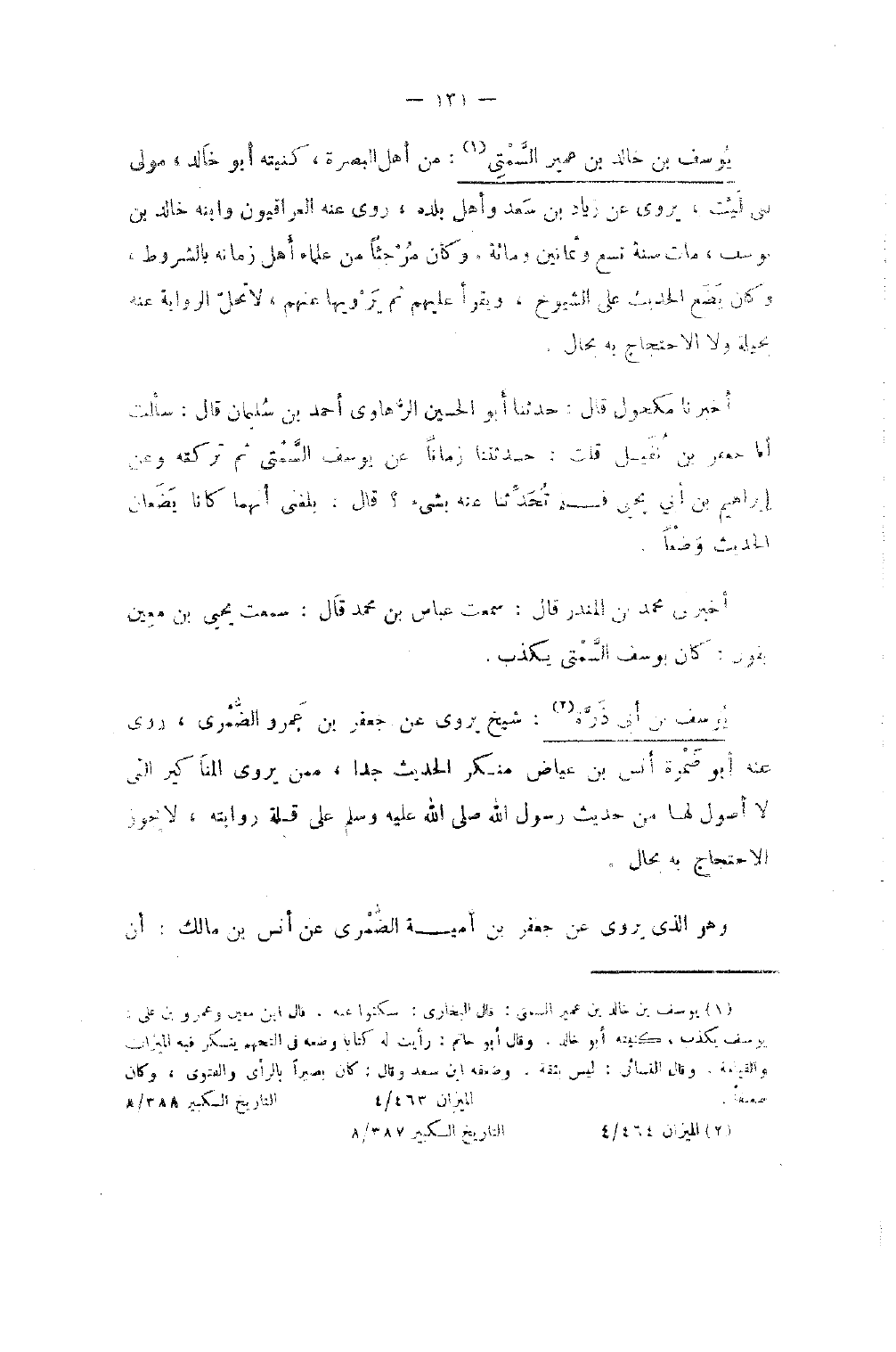 1228 - يُوسُف بن أبي ذرة شيخ يروي عَن جَعْفَر بن عَمْرو الضمرِي روى عَنهُ أَبُو ضَمرَة أنس بن عِيَاض مُنكر الحَدِيث جدا مِمَّن يروي الْمَنَاكِير الَّتِي لَا أصُول لَهَا من حَدِيث رَسُول الله صَلَّى اللَّهُ عَلَيْهِ وَسَلَّمَ عَلِيَّ قلَّة رِوَايَته لَا يَجُوز الِاحْتِجَاج بِهِ بِحَال وَهُوَ الَّذِي يَرْوِي عَنْ جَعْفَرِ بْنِ أُمَيَّةَ الضَّمْرِيِّ عَنْ أَنَسِ بْنِ مَالِكٍ أَنَّ