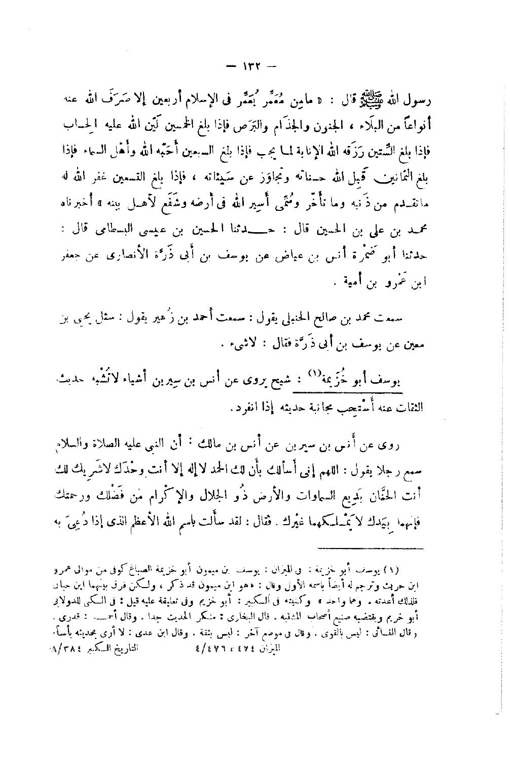 رَسُولُ اللَّهِ صَلَّى اللَّهُ عَلَيْهِ وَسَلَّمَ قَالَ مَا مِنْ مُعَمَّرٍ يُعَمَّرُ فِي الإِسْلامِ أَرْبَعِينَ إِلا صَرَفَ اللَّهُ عَنْهُ أَنْوَاعًا مِنَ الْبَلاءِ الْجُنُونِ وَالْجُذَامِ وَالبَّرَصِ فَإِذَا بَلَغَ الْخَمْسِينَ لَيَّنَ اللَّهُ عَلَيْهِ الْحِسَابَ فَإِذَا بَلَغَ السِّتِّينَ رَزَقَهُ الله الْإِنَابَة لما يجب فَإِذَا بَلَغَ السَّبْعِينَ أَحَبَّهُ اللَّهُ وَأَهْلُ السَّمَاءِ فَإِذَا بَلَغَ الثَّمَانِينَ قَبِلَ اللَّهُ حَسَنَاتِهِ وَتَجَاوَزَ عَنْ سَيِّئَاتِهِ فَإِذَا بَلَغَ التِّسْعِينَ غَفَرَ اللَّهُ لَهُ مَا تَقَدَّمَ مِنْ ذَنْبِهِ وَمَا تَأَخَّرَ وَسُمِّيَ أَسِيرَ اللَّهِ فِي أَرْضِهِ وَشَفَعَ لأَهْلِ بَيْتِهِ أَخْبَرَنَاهُ مُحَمَّدُ بْنُ عَلِيِّ بْنِ الْحُسَيْنِ قَالَ حَدَّثَنَا الْحُسَيْنُ بْنُ عِيسَى الْبسْطَامِيُّ قَالَ حَدَّثَنَا أَبُو ضَمرَة أنس بن عِيَاض عَنْ يُوسُفَ بْنِ أَبِي ذرة الأَنْصَارِيِّ عَنْ جَعْفَرِ بْنِ عَمْرِو بْنِ أُمَيَّةَ سَمِعْتُ مُحَمَّدَ بْنَ صَالِحٍ الْحَنْبَلِيَّ يَقُولُ سَمِعْتُ أَحْمَدَ بْن زُهَيْر يَقُول سُئِلَ يَحْيَى بْنُ مَعِينٍ عَنْ يُوسُفَ بْنِ أبي ذرة فَقَالَ لَا شَيْء