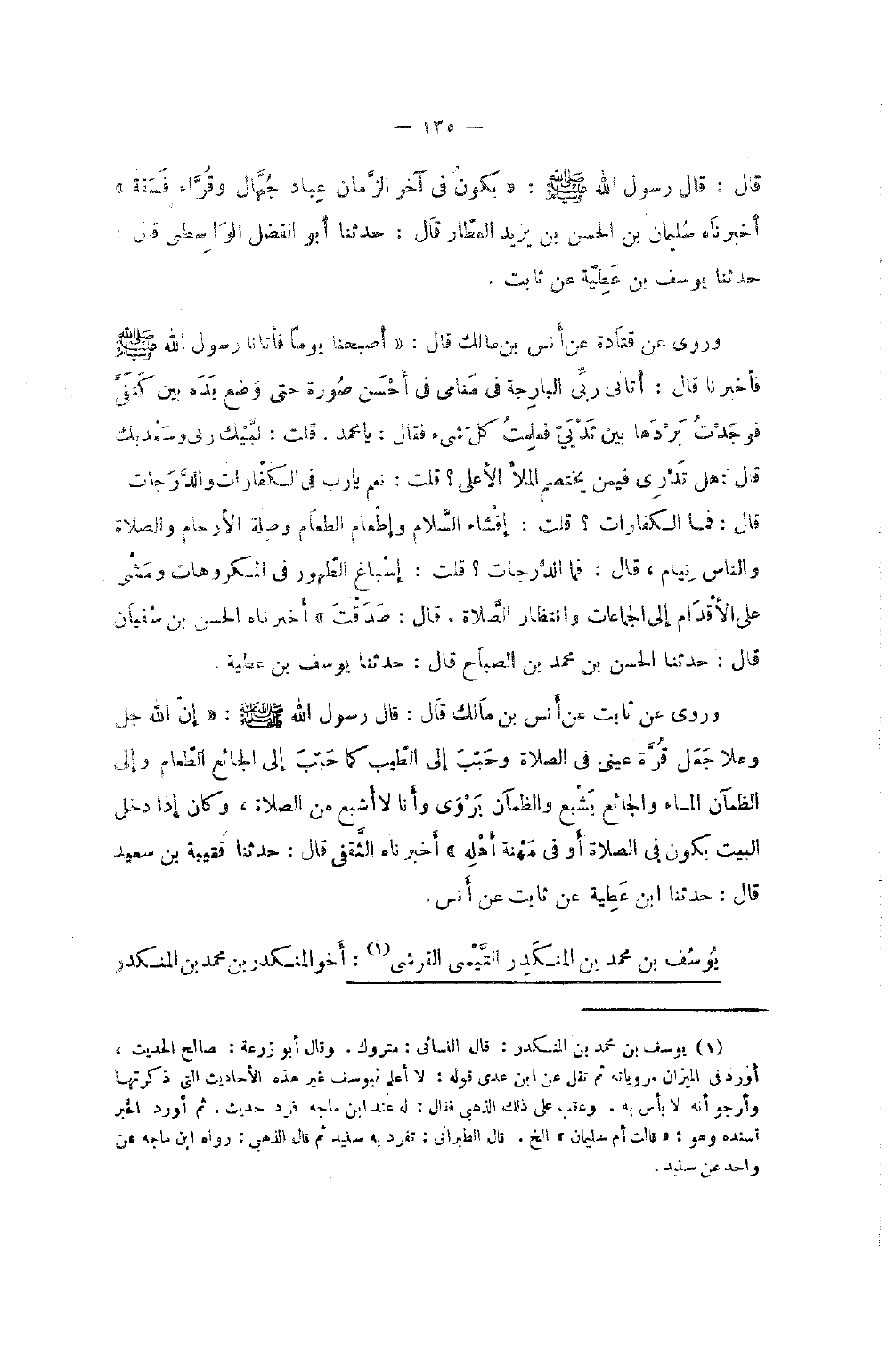 قَالَ قَالَ رَسُولُ اللَّهِ صَلَّى اللَّهُ عَلَيْهِ وَسَلَّمَ يَكُونُ فِي آخِرِ الزَّمَانِ عُبَّادٌ جُهَّالٌ وَقُرَّاءٌ فَسَقَةٌ أَخْبَرَنَاهُ سُلَيْمَانُ بْنُ الْحَسَنِ بْنِ يَزِيدَ الْعَطَّارُ قَالَ حَدَّثَنَا أَبُو الْفَضْلِ الْوَاسِطِيُّ قَالَ حَدَّثَنَا يُوسُفُ بْنُ عَطِيَّةَ عَنْ ثَابِتٍ وَرَوَى عَنْ قَتَادَةَ عَنْ أَنَسٍ بْنِ مَالِكٍ قَالَ أَصْبَحْنَا يَوْمًا فَأَتَانَا رَسُولُ اللَّهِ صَلَّى اللَّهُ عَلَيْهِ وَسَلَّمَ فَأَخْبَرَنَا قَالَ أَتَانِي رَبِّي الْبَارِحَةَ فِي مَنَامِي فِي أَحْسَنِ صُورَةٍ حَتَّى وَضَعَ يَدَهُ بَيْنَ كَتِفَيَّ فَوَجَدْتُ بَرْدَهَا بَيْنَ ثَدْيَيَّ فَعَلِمْتُ كُلَّ شَيْءٍ فَقَالَ يَا مُحَمَّدُ قُلْتُ لَبَّيْكَ رَبِّي وَسَعْدَيْكَ قَالَ هَلْ تَدْرِي فِيمَنْ يَخْتَصِمُ الْمَلأُ الأَعْلَى قُلْتُ نَعَمْ يَا رَبِّ فِي الْكَفَّارَاتِ وَالدَّرَجَاتِ قَالَ فَمَا الْكَفَّارَاتُ قُلْتُ إِفْشَاءُ السَّلامِ وَإِطْعَامُ الطَّعَامِ وَصِلَةُ الأَرْحَامِ وَالصَّلاةُ وَالنَّاسُ نِيَامٌ قَالَ فَمَا الدَّرَجَات قلت أَسْبَاع الطَّهُورِ فِي الْمَكْرُوهَاتِ وَمَشْيٌ عَلَى الأَقْدَامِ إِلَى الْجَمَاعَاتِ وَانْتِظَارُ الصَّلاةِ قَالَ صَدَقْتَ أَخْبَرَنَاهُ الْحَسَنُ بْنُ سُفْيَانَ قَالَ حَدَّثَنَا الْحَسَنُ بْنُ مُحَمَّد بن الصَّباح قَالَ حَدثنَا يُوسُفُ بْنُ عَطِيَّةَ وَرَوَى عَنْ ثَابِتٍ عَنْ أَنَسِ بْنِ مَالِك قَالَ قَالَ رَسُولُ اللَّهِ صَلَّى اللَّهُ عَلَيْهِ وَسَلَّمَ إِنَّ اللَّهَ جَلَّ وَعَلا جَعَلَ قُرَّةَ عَيْنِي فِي الصَّلاةِ وَحَبَّبَ إِلَيَّ الطِّيبَ كَمَا حَبَّبَ إِلَى الْجَائِعِ الطَّعَامَ وَإِلَى الظَّمْآنِ الْمَاءَ وَالْجَائِعُ يَشْبَعُ وَالظَّمْآنُ يُرْوَى وَأَنَا لَا أَشْبَعُ مِنَ الصَّلاةِ وَكَانَ إِذَا دَخَلَ الْبَيْتَ يَكُونُ فِي الصَّلاةِ أَوْ فِي مِهْنَةِ أَهْلِهِ أَخْبَرَنَاهُ الثَّقَفِيُّ قَالَ حَدثنَا قُتَيْبَة بن سعيد قَالَ حَدثنَا بن عَطِيَّة عَن ثَابت عَن أنس