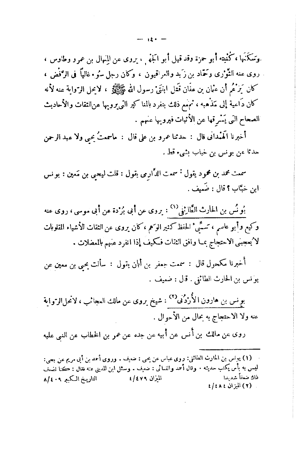 وسكنها كنيته أَبُو حَمْزَة وَقد قيل أَبُو الجهم يروي عَن الْمنْهَال بن عَمْرو وَطَاوُس روى عَنهُ الثَّوْريّ وَحَمَّاد بن زيد والعراقيون وَكَانَ رجل سوء غاليا فِي الرَّفْض كَانَ يزْعم أَن عُثْمَان بن عَفَّان قتل ابْنَتي رَسُولُ اللَّهِ صَلَّى اللَّهُ عَلَيْهِ وَسَلَّمَ لَا يحل الرِّوَايَة عَنهُ لِأَنَّهُ كَانَ دَاعِيَة إِلَى مذْهبه ثمَّ مَعَ ذَلِك ينْفَرد بِالْمَنَاكِيرِ الَّتِي يَرْوِيهَا عَن الثِّقَات وَالْأَحَادِيث الصِّحَاح الَّتِي يسرقها عَن الْأَثْبَات فيرويها عَنْهُم أَخْبَرَنَا الْهَمْدَانِيُّ قَالَ حَدثنَا عَمْرو بن عَليّ قَالَ مَا سَمِعْتُ يَحْيَى وَلا عَبْدَ الرَّحْمَنِ حَدَّثَا عَنْ يُونُسَ بْنِ خَبَّابٍ بِشْيَءٍ قَطُّ سَمِعْتُ مُحَمَّدَ بْنَ مَحْمُودٍ يَقُولُ سَمِعْتُ الدَّارِمِيَّ يَقُولُ قُلْتُ لِيَحْيَى بْنِ مَعِينٍ يُونُسَ بْنُ خَبَّابٍ قَالَ ضَعِيفٌ