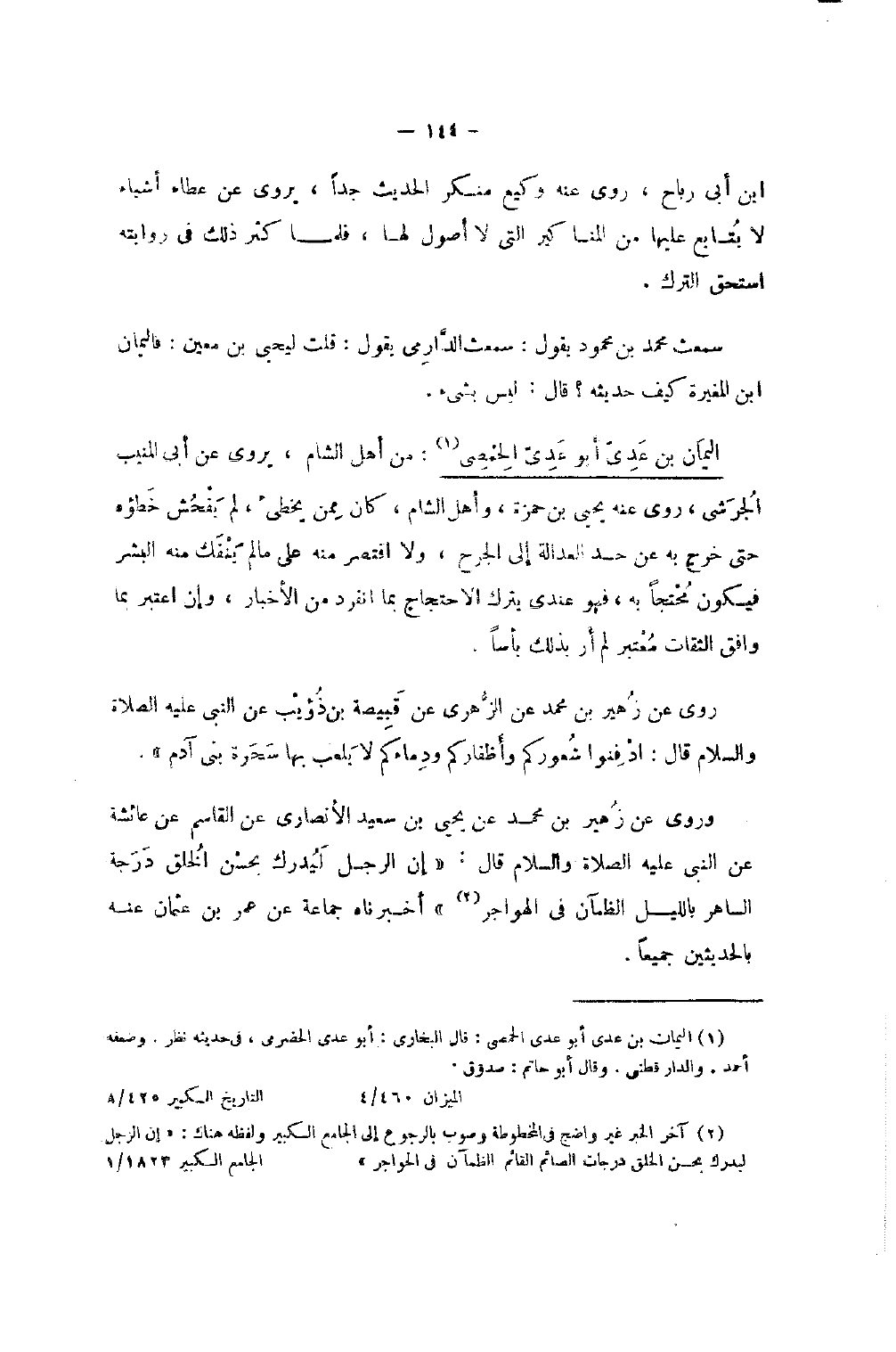 1251 - الْيَمَان بن عدي أَبُو عدي الْحِمصِي من أهل الشَّام يَرْوِي عَن أبي الْمُنِيب الجرشِي روى عَنهُ يحيى بن حَمْزَة وَأهل الشَّام كَانَ مِمَّن يخطىء لم يفحش خَطؤُهُ حَتَّى خرج بِهِ عَن حد الْعَدَالَة إِلَى الْجرْح وَلَا اقْتصر مِنْهُ على مَا لم يَنْفَكّ مِنْهُ الْبشر فَيكون محتجا بِهِ فَهُوَ عِنْدِي يتْرك الِاحْتِجَاج بِمَا انْفَرد من الْأَخْبَار وَإِن اعْتبر بِمَا وَافق الثِّقَات مُعْتَبر لم أر بذلك بَأْسا رَوَى عَنْ زُهَيْرِ بْنِ مُحَمَّدٍ عَنِ الزُّهْرِيِّ عَنْ قَبِيصَةَ بن ذُؤَيْب عَن النَّبِي صَلَّى اللَّهُ عَلَيْهِ وَسلم قَالَ ادْفِنُوا شُعُورَكُمْ وَأَظْفَارَكُمْ وَدِمَاءَكُمْ لَا يَلْعَبُ بِهَا سَحَرَةُ بَنِي آدَمَ وَرَوَى عَنْ زُهَيْرِ بْنِ مُحَمَّدٍ عَنْ يَحْيَى بْنِ سَعِيدٍ الأَنْصَارِيِّ عَنِ الْقَاسِمِ عَنْ عَائِشَةَ عَن النَّبِي صَلَّى اللَّهُ عَلَيْهِ وَسلم قَالَ إِن الرجل لَيُدْرِكُ بِحُسْنِ الْخُلُقِ دَرَجَةَ السَّاهِرِ بِاللَّيْلِ الظَّمْآنِ فِي الْهَوَاجِرِ أَخْبَرَنَاهُ جمَاعَة عَن عمر بن عُثْمَان عَنهُ بِالْحَدِيثين جَمِيعًا