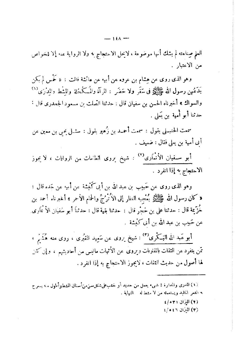 الْعلم صناعته لم يشك أَنَّهَا مَوْضُوعَة لَا يحل الِاحْتِجَاج بِهِ وَلَا الرِّوَايَة عَنهُ إِلَّا للخواص من الِاعْتِبَار وَهُوَ الَّذِي رَوَى عَنْ هِشَامِ بْنِ عُرْوَةَ عَنْ أَبِيهِ عَنْ عَائِشَةَ قَالَتْ خَمْسٌ لَمْ يَكُنْ يَدَعَهُنَّ رَسُولُ اللَّهِ صَلَّى اللَّهُ عَلَيْهِ وَسَلَّمَ فِي سَفَرٍ وَلا حَضَرٍ الْمِرْآةُ وَالْمِكْحَلَةُ وَالْمِشْطُ وَالْمِدْرَى وَالسِّوَاكُ أَخْبَرَنَاهُ الْحَسَنُ بْنُ سُفْيَانَ قَالَ حَدَّثَنَا الصَّلْتُ بْنُ مَسْعُودٍ الْجَحْدَرِيُّ قَالَ حَدَّثَنَا أَبُو أُمَيَّةَ بْنُ يَعْلَى سَمِعْتُ الْحَنْبَلِيَّ يَقُولُ سَمِعْتُ أَحْمَدَ بْنَ زُهَيْر يَقُول سُئِلَ يَحْيَى بْن مَعِينٍ عَنْ أَبِي أُمَيَّةَ بْنِ يَعْلَى فَقَالَ ضَعِيفٌ