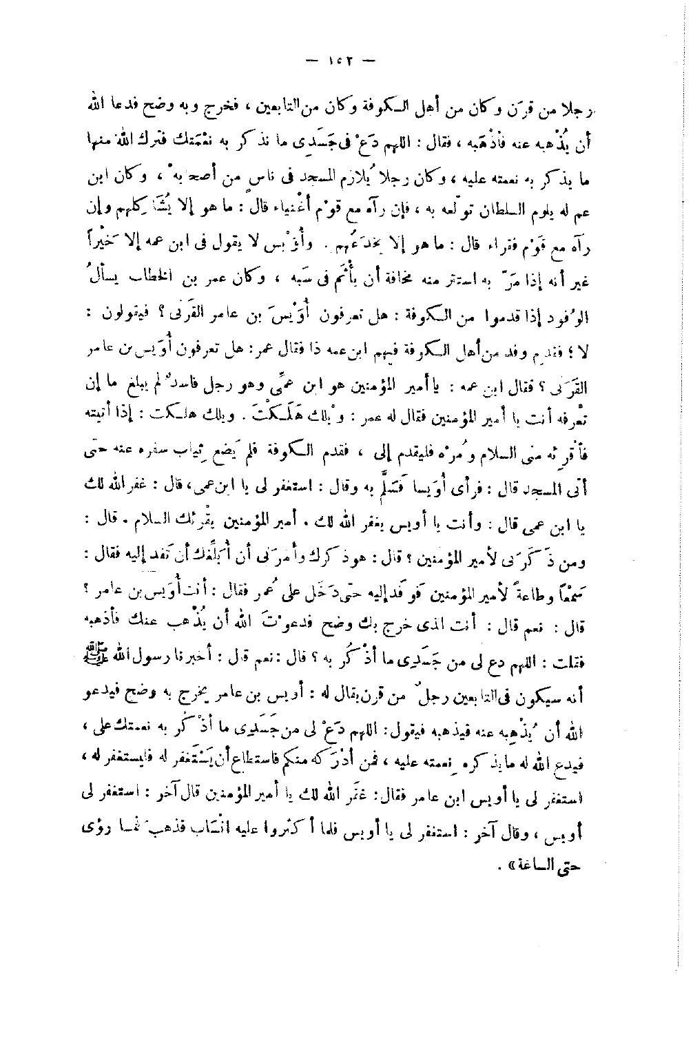 رَجُلا مِنْ قَرْنٍ وَكَانَ مِنْ أَهْلِ الْكُوفَةِ وَكَانَ مِنَ التَّابِعِينَ فَخَرَجَ وَبِهِ وَضَحٌ فَدَعَا اللَّهُ أَنْ يُذْهِبَهُ عَنْهُ فَأَذْهَبَهُ فَقَالَ اللَّهُمَّ دَعْ فِي جَسَدِي مَا نَذْكُرُ بِهِ نِعْمَتَكَ فَتَرَكَ اللَّهُ مِنْهَا مَا يَذْكُرُ بِهِ نِعْمَتَهُ عَلَيْهِ وَكَانَ رَجُلا يُلازِمُ الْمَسْجِدَ فِي نَاسٍ مِنْ أَصْحَابِهِ وَكَانَ بن عَمٍّ لَهُ يَلُومُ السُّلْطَانَ تَوَلُّعَهُ بِهِ فَإِنْ رَآهُ مَعَ قَوْمٍ أَغْنِيَاءَ قَالَ مَا هُوَ إِلَّا يُشَاكِلُهُمْ وَإِنْ رَآهُ مَعَ قَوْمٍ فُقَرَاءَ قَالَ مَا هُوَ إِلَّا يَخْدَعُهُمْ وَأُوَيْسٌ لَا يَقُولُ فِي بن عَمِّهِ إِلَّا خَيْرًا غَيْرَ أَنَّهُ إِذَا مَرَّ بِهِ اسْتَتَرَ مِنْهُ مَخَافَةَ أَنْ يَأْثَمَ فِي سَبِّهِ وَكَانَ عُمَرُ بْنُ الْخَطَّابِ يَسْأَلُ الْوُفُودَ إِذَا قَدِمُوا مِنَ الْكُوفَةِ هَلْ تَعْرِفُونَ أُوَيْسَ بْنَ عَامِرٍ الْقَرْنِيَّ فَيَقُولُونَ لَا فَقَدِمَ وَفْدٌ من أهل الْكُوفَة فيهم بن عَمِّهِ ذَا فَقَالَ عُمَرُ هَلْ تَعْرِفُونَ أُوَيْسَ بْنَ عَامِرٍ الْقَرْنِيَّ فَقَالَ بن عَمِّهِ يَا أَمِيرَ الْمُؤْمِنِينَ هُوَ بن عَمِّي وَهُوَ رَجُلٌ فَاسِدٌ لَمْ يَبْلُغْ مَا إِنْ تَعْرِفَهُ أَنْتَ يَا أَمِيرَ الْمُؤْمِنِينَ فَقَالَ لَهُ عُمَرُ وَيْلَكَ هَلَكْتَ وَيْلَكَ هَلَكْتَ إِذَا أَتَيْتَهُ فَأَقْرِئْهُ مِنِّي السَّلامَ وَمُرْهُ فَلْيَقْدَمْ إِلَيَّ فَقَدِمَ الْكُوفَةَ فَلَمْ يَضَعْ ثِيَابَ سَفَرِهِ عَنْهُ حَتَّى أَتَى الْمَسْجِدَ قَالَ فَرَأَى أُوَيْسًا فَسَلَّمَ بِهِ وَقَالَ اسْتَغْفِرْ لي يَا بن عَمِّي قَالَ غَفَرَ اللَّهُ لَكَ يَا بن عَمِّي قَالَ وَأَنْتَ يَا أُوَيْسُ يَغْفِرُ اللَّهُ لَكَ أَمِيرُ الْمُؤْمِنِينَ يقرئكم السَّلامَ قَالَ وَمَنْ ذَكَرَنِي لأَمِيرِ الْمُؤْمِنِينَ قَالَ هُوَ ذَكَرَكَ وَأَمَرَنِي أَنْ أُبَلِّغَكَ أَنْ تَفِدَ إِلَيْهِ فَقَالَ سَمْعًا وَطَاعَةً لأَمِيرِ الْمُؤْمِنِينَ فَوَفَدَ إِلَيْهِ حَتَّى دَخَلَ عَلَى عُمَرَ فَقَالَ أَنْتَ أُوَيْسُ بْنُ عَامِرٍ قَالَ نَعَمْ قَالَ أَنْتَ الَّذِي خَرَجَ بِكَ وَضَحٌ فَدَعَوْتَ اللَّهَ أَنْ يُذْهِبَ عَنْكَ فَأَذْهَبَهُ فَقُلْتَ اللَّهُمَّ دَعْ لِي مِنْ جَسَدِي مَا أَذْكُرُ بِهِ قَالَ نَعَمْ قَالَ أَخْبَرَنَا رَسُولُ اللَّهِ صَلَّى اللَّهُ عَلَيْهِ وَسَلَّمَ إِنَّه سَيَكُونُ فِي التَّابِعِينَ رَجُلٌ مِنْ قَرْنٍ يُقَالُ لَهُ أُوَيْسُ بْنُ عَامِرٍ يَخْرُجُ بِهِ وَضْحٌ فَيَدْعُو الله أَن يذبه عَنْهُ فَيُذْهِبَهُ فَيَقُولُ اللَّهُمَّ دَعْ لِي مِنْ جَسَدِي مَا أَذْكُرُ بِهِ نِعْمَتَكَ عَلَيَّ فَيَدَعُ اللَّهُ لَهُ مَا يُذَكِّرُهُ نِعْمَتَهُ عَلَيْهِ فَمَنْ أَدْرَكَهُ مِنْكُمْ فَاسْتَطَاعَ أَنْ يَسْتَغْفِرَ لَهُ فَلْيَسْتَغْفِرْ لَهُ اسْتَغْفِرْ لِي يَا أُوَيْسُ بْنُ عَامِرٍ فَقَالَ غَفَرَ اللَّهُ لَكَ يَا أَمِيرَ الْمُؤْمِنِينَ قَالَ آخَرُ اسْتَغْفِرْ لِي أُوَيْسُ وَقَالَ آخَرُ اسْتَغْفِرْ لِي يَا أُوَيْسُ فَلَمَّا أَكْثَرُوا عَلَيْهِ انْسَابَ فَذَهَبَ فَمَا رُؤِيَ حَتَّى السَّاعَة