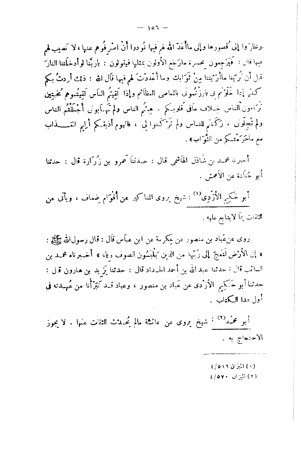1275 - أَبُو حَكِيم الْأَزْدِيّ شيخ يروي الْمَنَاكِير عَن أَقوام ضِعَاف وَيَأْتِي عَن الثِّقَات بِمَا لَا يُتَابع عَلَيْهِ رَوَى عَنْ عَبَّادِ بْنِ مَنْصُورٍ عَن عِكْرِمَة عَن بن عَبَّاسٍ قَالَ قَالَ رَسُولُ اللَّهِ صَلَّى اللَّهُ عَلَيْهِ وَسَلَّمَ أَن الأَرْضَ لَتَعُجُّ إِلَى رَبِّهَا مِنَ الَّذِينَ يَلْبَسُونَ الصُّوفَ رِيَاءً أَخْبَرَنَاهُ مُحَمَّدُ بْنُ السَّائِبِ قَالَ حَدَّثَنَا عَبْدُ اللَّهِ بْنُ أَحْمَدَ الْحَدَّادُ قَالَ حَدَّثَنَا يَزِيدُ بْنُ هَارُونَ قَالَ حَدَّثَنَا أَبُو حَكِيمٍ الأَزْدِيُّ عَنْ عَبَّادِ بْنِ مَنْصُورٍ وَعَبَّادٌ قَدْ تَبَرَّأْنَا مِنْ عُهْدَتِهِ فِي أول هَذَا الْكتاب
