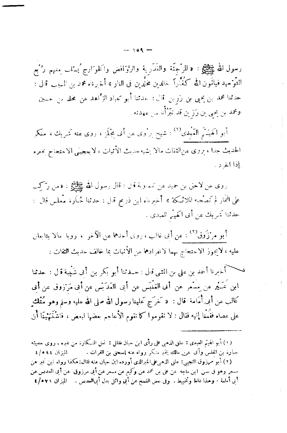 صَلَّى اللَّهُ عَلَيْهِ وَسَلَّمَ الْمُرْجِئَةُ وَالْقَدَرِيَّةُ وَالرَّوَافِضُ وَالْخَوَارِجُ يُسْلَبُ مِنْهُمْ رُبْعُ التَّوْحِيدِ فَيَلْقَوْنَ اللَّهَ كُفَّارًا خَالِدِينَ مُخَلَّدِينَ فِي النَّارِ أَخْبَرَنَاهُ مُحَمَّدُ بْنُ الْمُسَيِّبِ قَالَ حَدَّثَنَا مُحَمَّدُ بْنُ يَحْيَى بْنِ رَزِينٍ قَالَ حَدَّثَنَا أَبُو عَبَّادٍ الزَّاهِدُ عَنْ مَخْلَدِ بْنِ حُسَيْنٍ وَمُحَمَّدُ بْنُ يَحْيَى بْنِ رَزِينٍ قَدْ تبرأنا من عهدته
