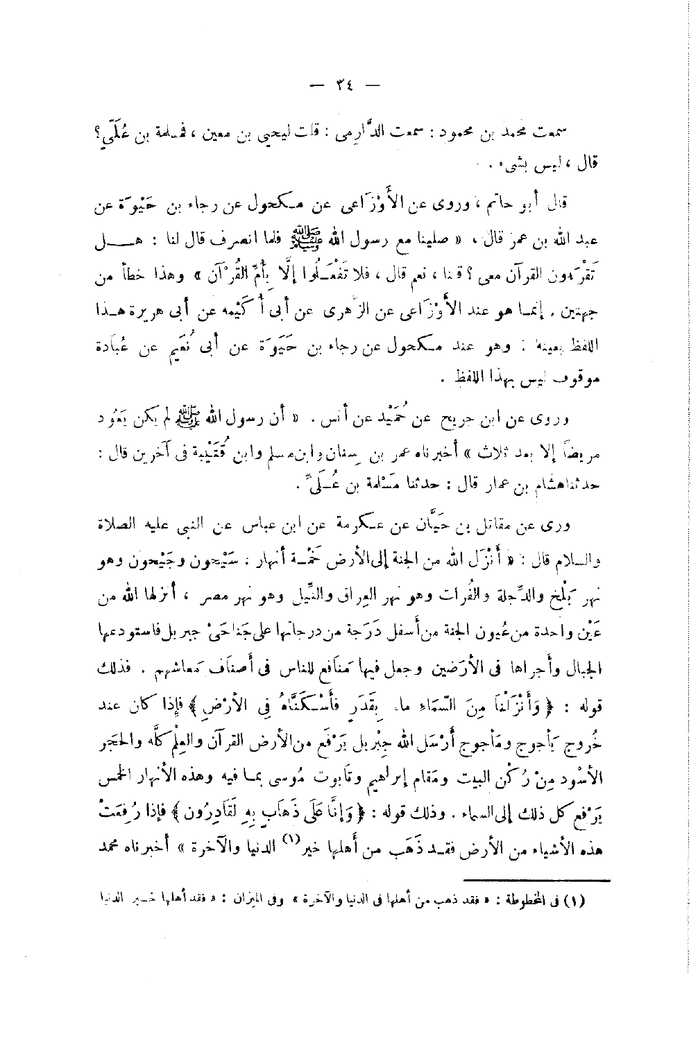 سَمِعْتُ مُحَمَّدَ بْنَ مَحْمُودٍ سَمِعْتُ الدَّارمِيّ قلت ليحيى بن معِين فَمَسْلَمَةَ بْنِ عَلِيٍّ قَالَ لَيْسَ بِشَيْءٍ قَالَ أَبُو حَاتِم وَرَوَى عَنِ الأَوْزَاعِيِّ عَنْ مَكْحُولٍ عَنْ رَجَاءِ بْنِ حَيْوَةَ عَنْ عَبْدِ اللَّهِ بْنِ عُمَرَ قَالَ صَلَّيْنَا مَعَ رَسُولِ اللَّهِ صَلَّى اللَّهُ عَلَيْهِ وَسَلَّمَ فَلَمَّا انْصَرَفَ قَالَ لنا هَل تقرؤون الْقُرْآنَ مَعِي قُلْنَا نَعَمْ قَالَ فَلا تَفْعَلُوا إِلا بِأُمِّ الْقُرْآنِ وَهَذَا خَطَأٌ مِنْ جِهَتَيْنِ إِنَّمَا هُوَ عِنْدَ الأَوْزَاعِيِّ عَنِ الزُّهْرِيِّ عَنْ أَبِي هُرَيْرَةَ هَذَا اللَّفْظُ بِعَيْنِهِ وَهُوَ عِنْدَ مَكْحُولٍ عَنْ رَجَاءِ بْنِ حَيْوَةَ عَنْ أَبِي نُعَيْمٍ عَنْ عُبَادَةَ مَوْقُوفٌ لَيْسَ بِهَذَا اللَّفْظ وَرُوِيَ عَن بن جريح عَنْ حُمَيْدٍ عَنْ أَنَسٍ أَنَّ رَسُولُ اللَّهِ صَلَّى اللَّهُ عَلَيْهِ وَسَلَّمَ لَمْ يَكُنْ يَعُودُ مَرِيضًا إِلا بَعْدَ ثَلاثٍ أَخْبَرَنَاهُ عُمَرُ بْنُ سِنَانٍ وَابْنُ مُسْلِمٍ وَابْنُ قُتَيْبَةَ فِي آخَرِينَ قَالَ حَدَّثَنَا هِشَامُ بْنُ عَمَّارٍ قَالَ حَدَّثَنَا مَسْلَمَةُ بْنُ عَلِيٍّ وَرَوَى عَنْ مُقَاتِلِ بْنِ حَيَّانَ عَنْ عِكْرِمَةَ عَن بن عَبَّاسٍ عَنِ النَّبِيِّ صَلَّى اللَّهُ عَلَيْهِ وَسلم قَالَ أَنْزَلَ اللَّهُ مِنَ الْجَنَّةِ إِلَى الأَرْضِ خَمْسَةَ أنْهَارٍ سَيْحُونَ وَجَيْحُونَ وَهُوَ نَهْرُ بَلْخَ وَالدِّجْلَةَ وَالْفُرَاتَ وَهُوَ نَهْرُ الْعِرَاقِ وَالنِّيلُ وَهُو نَهْرُ مِصْرَ أَنْزَلَهَا اللَّهُ مِنْ عَيْنٍ وَاحِدَةٍ مِنْ عُيُونِ الْجَنَّةِ مِنْ أَسْفَلِ دَرَجَةٍ مِنْ دَرَجَاتِهَا عَلَى جَنَاحَيْ جِبْرِيلَ فَاسْتَوْدَعَهَا الْجِبَالَ وَأَجْرَاهَا فِي الأَرَضِينَ وَجَعَلَ فِيهَا مَنَافِعَ لِلنَّاسِ فِي أَصْنَافِ مَعَاشِهِمْ فَذَلِكَ قَوْلُهُ وَأَنْزَلْنَا مِنَ السَّمَاءِ مَاءً بِقَدَرٍ فَأَسْكَنَّاهُ فِي الأَرْض فَإِذَا كَانَ عِنْدَ خُرُوجِ يَأْجُوجَ وَمَأْجُوجَ أَرْسَلَ اللَّهُ جِبْرِيلَ يَرْفَعُ مِنَ الأَرْضِ الْقُرْآنَ وَالْعِلْمَ كُلَّهُ وَالْحَجَرَ الأَسْوَدَ مِنْ رُكْنِ الْبَيْتِ وَمَقَامَ إِبْرَاهِيمَ وَتَابُوتَ مُوسَى بِمَا فِيهِ وَهَذِهِ الأنَهَارَ الْخَمْسَ يَرْفَعُ كُلَّ ذَلِكَ إِلَى السَّمَاءِ وَذَلِكَ قَوْلُهُ وَإِنَّا عَلَى ذَهَابٍ بِهِ لقادرون فَإِذَا رُفِعَتْ هَذِهِ الأَشْيَاءُ مِنَ الأَرْضِ فَقَدْ ذَهَبَ مِنْ أَهْلِهَا خَيْرُ الدُّنْيَا وَالآخِرَةِ أَخْبَرَنَاهُ مُحَمَّدُ