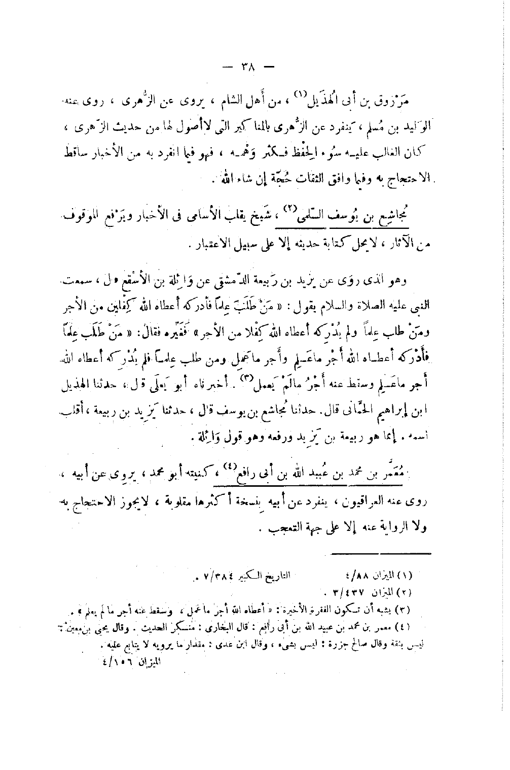 1087 - مجاشع بن يُوسُف السّلمِيّ شيخ يقلب الْأَسَامِي فِي الْأَخْبَار وَيرْفَع الْمَوْقُوف من الْآثَار لَا يحل كِتَابَة حَدِيثه إِلَّا عَلَى سَبِيل الِاعْتِبَار وَهُوَ الَّذِي رَوَى عَنْ يَزِيدَ بْنِ ربيعَة الدِّمَشْقِي عَن وائلة بْنِ الأَسْقَعِ قَالَ سَمِعْتُ النَّبِيَّ صَلَّى اللَّهُ عَلَيْهِ وَسَلَّمَ يَقُولُ مَنْ طَلَبَ عِلْمًا فَأَدْرَكَهُ أَعْطَاهُ اللَّهُ كِفْلَيْنِ مِنَ الأَجْرِ وَمَنْ طَلَبَ عِلْمًا وَلَمْ يُدْرِكْهُ أَعْطَاهُ اللَّهُ كِفْلا مِنَ الأَجْرِ فَغَيَّرَهُ فَقَالَ مَنْ طَلَبَ عِلْمًا فَأَدْرَكَهُ أَعْطَاهُ اللَّهُ أَجْرَ مَا عَلِمَ وَأَجْرَ مَا عَمِلَ وَمَنْ طَلَبَ عِلْمًا فَلَمْ يُدْرِكْهُ أَعْطَاهُ اللَّهُ أَجْرَ مَا عَلِمَ وَسَقَطَ عَنْهُ أَجْرَ مَا لَمْ يَعْمَلْ أَخْبَرَنَاهُ أَبُو على قَالَ حَدَّثَنَا الْهُذَيْلُ بْنُ إِبْرَاهِيمَ الْحِمَّانِيُّ قَالَ حَدَّثَنَا مُجَاشِعُ بْنُ يُوسُفَ قَالَ حَدَّثَنَا يَزِيدُ بْنُ رَبِيعَةَ أَقْلَبَ اسْمَهُ إِنَّمَا هُوَ رَبِيعَةُ بْنُ يَزِيدَ وَرَفَعَهُ وَهُوَ قَول وائلة
