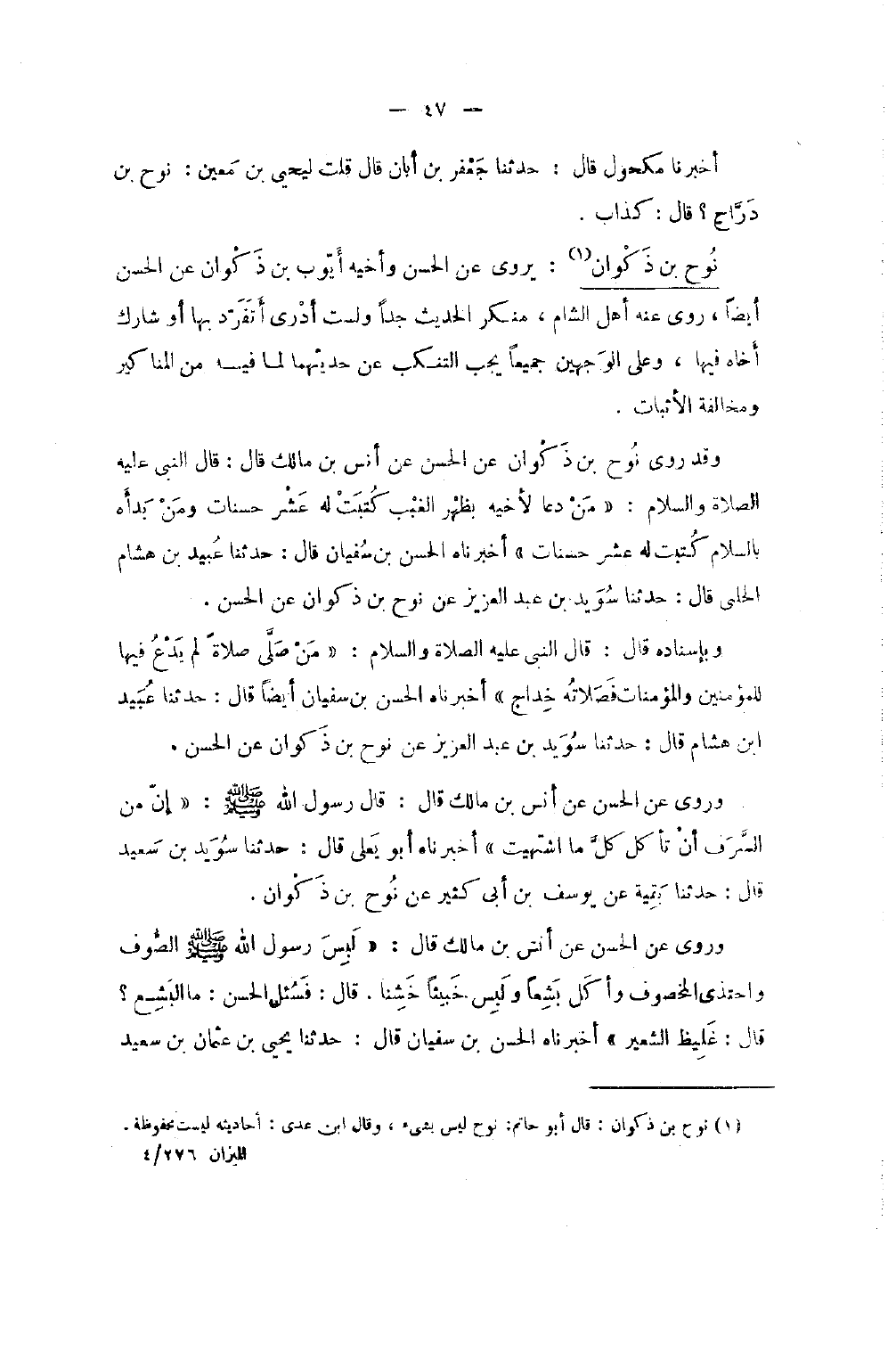 1102 - نوح بن ذكْوَان يروي عَن الْحسن وأخيه أَيُّوب بن ذكْوَان عَن الْحسن أَيْضا روى عَنْهُ أهل الشَّام مُنكر الحَدِيث جدا وَلست أَدْرِي أتفرد بهَا أَو شَارك أَخَاهُ فِيهَا وعَلى الْوَجْهَيْنِ جَمِيعًا يجب التنكب عَن حَدِيثهمَا لما فِيهِ من الْمَنَاكِير وَمُخَالفَة الْأَثْبَات وَقَدْ رَوَى نُوحُ بْنُ ذَكْوَانَ عَنِ الْحَسَنِ عَنْ أَنَسِ بْنِ مَالِكٍ قَالَ قَالَ النَّبِيُّ صَلَّى اللَّهُ عَلَيْهِ وَسلم مَنْ دَعَا لأَخِيهِ بِظَهْرِ الْغَيْبِ كُتِبَتْ لَهُ عَشْرُ حَسَنَاتٍ وَمَنْ بَدَأَهُ بِالسَّلامِ كُتِبَتْ لَهُ عَشْرُ حَسَنَاتٍ أَخْبَرَنَاهُ الْحَسَنُ بْنُ سُفْيَانَ قَالَ حَدَّثَنَا عُبَيْدُ بْنُ هِشَامٍ الْحَلَبِيُّ قَالَ حَدَّثَنَا سُوَيْدُ بْنُ عَبْدِ الْعَزِيزِ عَنْ نُوحِ بْنِ ذَكْوَانَ عَنِ الْحَسَنِ وَبِإِسْنَادِهِ قَالَ قَالَ النَّبِيُّ صَلَّى اللَّهُ عَلَيْهِ وَسَلَّمَ مَنْ صَلَّى صَلاةً لَمْ يَدْعُ فِيهَا لِلْمُؤْمِنِينَ وَالْمُؤْمِنَاتِ فَصَلاتُهُ خِدَاجٌ أَخْبَرَنَاهُ الْحَسَنُ بْنُ سُفْيَانَ أَيْضًا قَالَ حَدَّثَنَا عُبَيْدُ بْنُ هِشَامٍ قَالَ حَدَّثَنَا سُوَيْدُ بْنُ عَبْدِ الْعَزِيزِ عَنْ نُوحِ بْنِ ذَكْوَانَ عَنِ الْحَسَنِ وَرَوَى عَنِ الْحَسَنِ عَنْ أَنَسِ بْنِ مَالِكٍ قَالَ قَالَ رَسُولُ اللَّهِ صَلَّى اللَّهُ عَلَيْهِ وَسَلَّمَ إِنَّ مِنَ السَّرَفِ أَنْ تَأْكُلَ كُلَّ مَا اشْتَهَيْتَ أَخْبَرَنَاهُ أَبُو يَعْلَى قَالَ حَدَّثَنَا سُوَيْدُ بْنُ سَعِيدٍ قَالَ حَدَّثَنَا بَقِيَّةُ عَنْ يُوسُفَ بْنِ أَبِي كَثِيرٍ عَنْ نُوحِ بْنِ ذَكْوَانَ وَرَوَى عَنِ الْحَسَنِ عَنْ أَنَسِ بْنِ مَالِكٍ قَالَ لَبِسَ رَسُولُ اللَّهِ صَلَّى اللَّهُ عَلَيْهِ وَسَلَّمَ الصُّوفَ وَاحْتَذَى الْمَخْصُوفَ وَأَكَلَ بَشِعًا وَلَبِسَ خَبِيثًا خَشِنًا قَالَ فَسُئِلَ الْحَسَنُ مَا الْبَشِعُ قَالَ غَلِيظُ الشَّعِيرِ أَخْبَرَنَاهُ الْحَسَنُ بْنُ سُفْيَانَ قَالَ حَدَّثَنَا يَحْيَى بْنُ عُثْمَان بن سعيد
