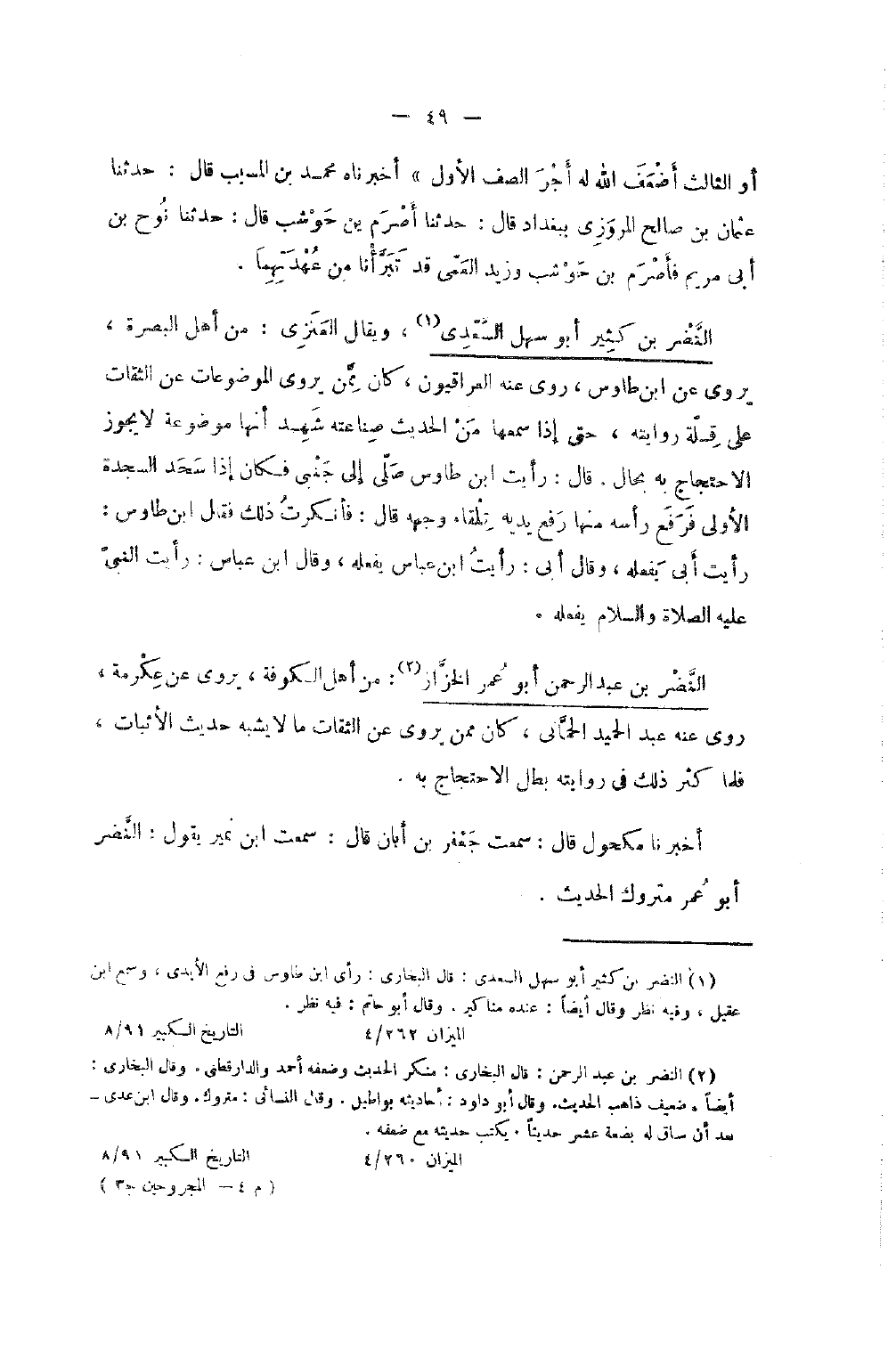 1104 - النَّضر بن كثير أَبُو سهل السَّعْدِيّ وَيُقَال الْعَنزي من أهل الْبَصْرَة يرْوى عَن بن طَاوس روى عَنهُ الْعِرَاقِيُّونَ كَانَ مِمَّن يروي الموضوعات عَن الثِّقَات على قلَّة رِوَايَته حَتَّى إِذا سَمعهَا من الْحَدِيث صناعته شهد أَنَّهَا مَوْضُوعَة لَا يجوز الِاحْتِجَاج بِهِ بِحَال قَالَ رَأَيْت بن طَاوُسٍ صَلَّى إِلَى جَنْبِي فَكَانَ إِذَا سَجَدَ السَّجْدَةَ الأُولَى فَرَفَعَ رَأْسَهُ مِنْهَا رَفَعَ يَدَيْهِ تِلْقَاءَ وَجْهِهِ قَالَ فَأَنْكَرْتُ ذَلِكَ فَقَالَ بن طَاوُسٍ رَأَيْتُ أَبِي يَفْعَلُهُ وَقَالَ أبي رَأَيْت بن عَبَّاس يَفْعَله وَقَالَ بن عَبَّاس رَأَيْت النَّبِي صَلَّى اللَّهُ عَلَيْهِ وَسلم يَفْعَله