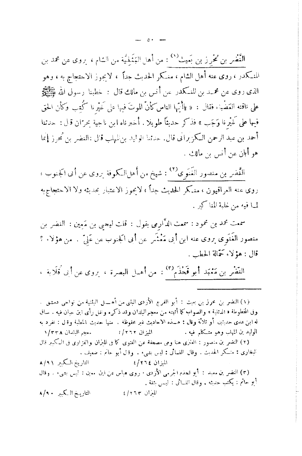 1107 - النَّضر بن مَنْصُور الغنوي شيخ من أهل الْكُوفَة يَرْوِي عَن أَبِي الْجنُوب روى عَنهُ الْعِرَاقِيُّونَ مُنكر الحَدِيث جدا لَا يجوز الِاعْتِبَار بحَديثه وَلَا الِاحْتِجَاج بِهِ لما فِيهِ من غَلَبَة الْمَنَاكِير سَمِعْتُ مُحَمَّدَ بْنَ مَحْمُودٍ سَمِعْتُ الدَّارِمِيَّ يَقُولُ قُلْتُ لِيَحْيَى بْنِ مَعِينٍ النَّضْرُ بْنُ مَنْصُورٍ الْغَنَوِيُّ يَرْوِي عَنهُ بن أَبِي مَعْشَرٍ عَنْ أَبِي الْجَنُوبِ عَنْ عَلِيٍّ مَنْ هَؤُلاءِ قَالَ هَؤُلاءِ حَمَّالَةُ الْحَطَبِ
