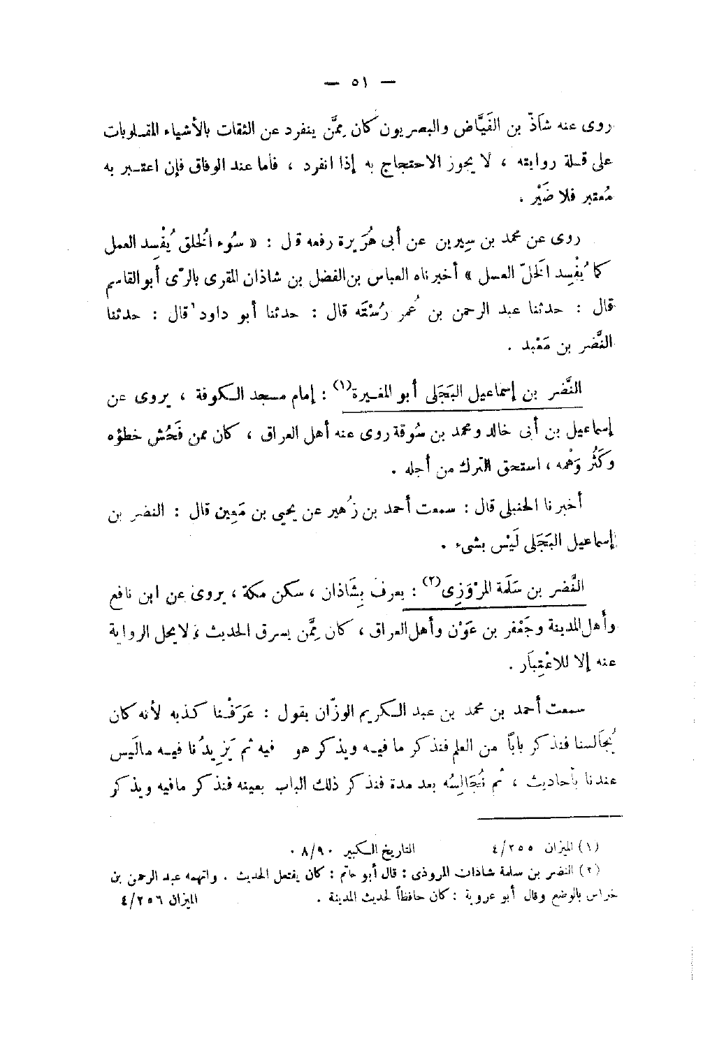 1110 - النَّضر بن سَلمَة الْمروزِي يعرف بشاذان سكن مَكَّة يروي عَن بن نَافِع وَأهل الْمَدِينَة وجعفر بن عون وَأهل الْعرَاق كَانَ مِمَّن يسرق الحَدِيث لَا يحل الرِّوَايَة عَنهُ إِلَّا للاعتبار سَمِعت أَحْمد بن مُحَمَّد بن عبد الْكَرِيم الْوزان يَقُول عرفنَا كذبه لِأَنَّهُ كَانَ يجالسنا فَنَذْكُر بَاب من الْعلم فَنَذْكُر مَا فِيهِ وَيذكر هُوَ فِيهِ ثمَّ يزيدنا فِيهِ مَا لَيْسَ عندنَا بِأَحَادِيث ثمَّ نجالسه بعد مُدَّة فَنَذْكُر ذَلِك الْبَاب بِعَيْنِه فَنَذْكُر مَا فِيهِ وَيذكر