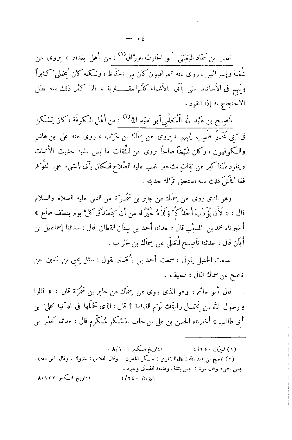 1115 - نصر بن حَمَّاد البَجلِيّ أَبُو الْحَارِث الْوراق من أهل بَغْدَاد يروي عَن شُعْبَة وَإِسْرَائِيل روى عَنهُ الْعِرَاقِيُّونَ كَانَ من الْحفاظ وَلكنه كَانَ يخطىء كثيرا ويهم فِي الْأَسَانِيد حَتَّى يَأْتِي بالأشياء كَأَنَّهَا مَقْلُوبَة فَلَمَّا كثر ذَلِك مِنْهُ بَطل الِاحْتِجَاج بِهِ إِذا انْفَرد
