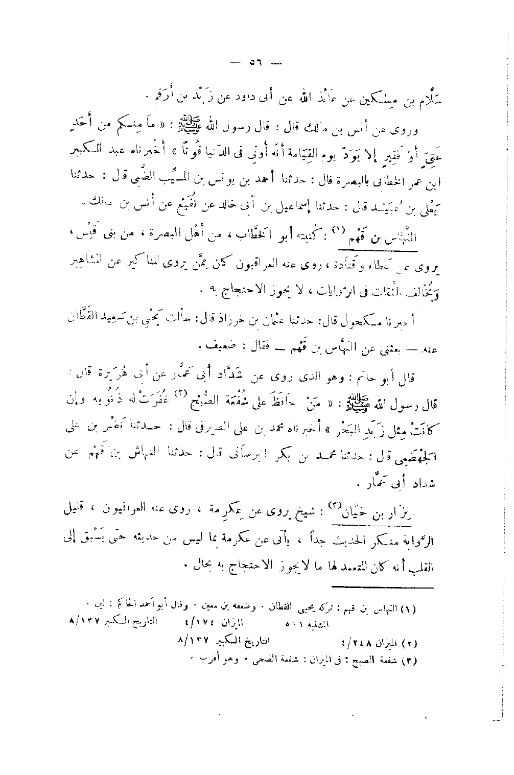 1119 - النهاس بن قهم كنيته أَبُو الْخطاب من أهل الْبَصْرَة من بني قيس يروي عَن عَطاء وَقَتَادَة روى عَنْهُ الْعِرَاقِيُّونَ كَانَ مِمَّن يروي الْمَنَاكِير عَن الْمَشَاهِير وَيُخَالف الثِّقَات فِي الرِّوَايَات لَا يجوز الِاحْتِجَاج بِهِ أخبرنَا مَكْحُول قَالَ حَدثنَا عُثْمَان بن خرزاذ قَالَ سَأَلْتُ يَحْيَى بْنَ سَعِيدٍ الْقَطَّانَ عَنْهُ يَعْنِي عَنِ النَّهَّاسِ بْنِ قَهْمٍ فَقَالَ ضَعِيفٌ قَالَ أَبُو حَاتِم وَهُوَ الَّذِي رَوَى عَنْ شَدَّادٍ أَبِي عَمَّارٍ عَنْ أَبِي هُرَيْرَةَ قَالَ قَالَ رَسُولُ اللَّهِ صَلَّى اللَّهُ عَلَيْهِ وَسَلَّمَ مَنْ حَافَظَ عَلَى شُفْعَةِ الصُّبْحِ غُفِرَتْ لَهُ ذُنُوبُهُ وَإِنْ كَانَتْ مِثْلَ زَبَدِ الْبَحْرِ أَخْبَرَنَاهُ مُحَمَّدُ بْنُ عَلِيٍّ الصَّيْرَفِيُّ قَالَ حَدَّثَنَا نَضْرُ بْنُ عَلِيٍّ الَجْهَضِمُّي قَالَ حَدَّثَنَا مُحَمَّدُ بْنُ بَكْرٍ الْبُرْسَانِيُّ قَالَ حَدَّثَنَا النَّهَّاسُ بْنُ قَهْمٍ عَنْ شَدَّاد أبي عمار