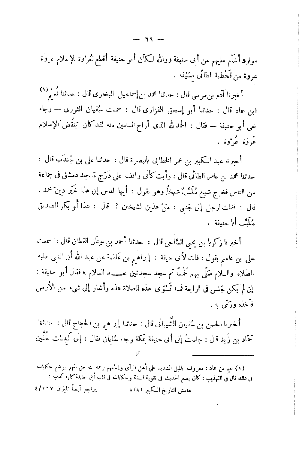 مَوْلُودٌ أَشْأَمُ عَلَيْهِمْ مِنْ أَبِي حنيفَة وَللَّه لكأن أَبُو حَنِيفَةَ أَقْطَعُ لِعُرْوَةِ الإِسْلامِ عُرْوَةً عُرْوَةً مِنْ قَحْطَبَةَ الطَّائِيِّ بِسَيْفِهِ أَخْبَرَنَا آدَمُ بْنُ مُوسَى قَالَ حَدَّثَنَا مُحَمَّدُ بْنُ إِسْمَاعِيلَ الْبُخَارِيُّ قَالَ حَدثنَا نعيم بن حَمَّاد قَالَ حَدَّثَنَا أَبُو إِسْحَاقَ الْفَزَارِيُّ قَالَ سَمِعْتُ سُفْيَانَ الثَّوْرِيَّ وَجَاءَ نعي أَبُو حَنِيفَةَ فَقَالَ الْحَمْدُ لِلَّهِ الَّذِي أَرَاحَ الْمُسْلِمِينَ مِنْهُ لَقَدْ كَانَ يَنْقُضُ الإِسْلامَ عُرْوَةً عُرْوَةً أَخْبَرَنَا عبد الْكَبِير عُمَرَ الْخَطَّابِيُّ بِالْبَصْرَةِ قَالَ حَدَّثَنَا عَلِيُّ بْنُ جُنْدُبٍ قَالَ حَدَّثَنَا مُحَمَّدُ بْنُ عَامِرٍ الطَّائِيُّ قَالَ رَأَيْتُ كَأَنِّي وَاقِفٌ عَلَى دَرَجِ مَسْجِدِ دِمَشْقَ فِي جَمَاعَةٍ مِنَ النَّاسِ فَخَرَجَ شَيْخٌ مُلَبِّبُ شَيْخًا وَهُوَ يَقُولُ أَيُّهَا النَّاسُ إِنَّ هَذَا غَيْرُ دِينِ مُحَمَّدٍ قَالَ فَقُلْتُ لِرَجُلٍ إِلَى جَنْبِي مَنْ هَذَيْنِ الشَّيْخَيْنِ قَالَ هَذَا أَبُو بَكْرٍ الصِّدِّيقِ مُلَبِّبُ أَبَا حَنِيفَةَ أَخْبَرَنَا زَكَرِيَّا بْنُ يَحْيَى السَّاجِيُّ قَالَ حَدَّثَنَا أَحْمَدُ بْنُ سِنَانٍ الْقَطَّانُ قَالَ سَمِعْتُ عَلِيَّ بْنَ عَاصِمٍ يَقُولُ قُلْتُ لأَبِي حَنِيفَةَ إِبْرَاهِيمَ بْنِ عَلْقَمَةَ عَنْ عَبْدِ اللَّهِ أَنَّ النَّبِيَّ صَلَّى اللَّهُ عَلَيْهِ وَسلم صلى بهما خَمْسًا ثُمَّ سَجَدَ سَجْدَتَيْنِ بَعْدَ السَّلامِ فَقَالَ أَبُو حَنِيفَةَ إِنْ لَمْ يَكُنْ جَلَسَ فِي الرَّابِعَةِ فَمَا تَسْوَى هَذِهِ الصَّلاةُ هَذِهِ وَأَشَارَ إِلَى شَيْءٍ مِنَ الأَرْضِ فَأَخَذَهُ وَرَمَى بِهِ أَخْبَرَنَا الْحَسَنُ بْنُ سُفْيَانَ الشَّيْبَانِيُّ قَالَ حَدَّثَنَا إِبْرَاهِيمُ بْنُ الْحَجَّاجِ قَالَ حَدَّثَنَا حَمَّادُ بْنُ زَيْدٍ قَالَ جَلَسْتُ إِلَى أَبِي حَنِيفَةَ بِمَكَّةَ وَجَاءَ سُلَيْمَانُ فَقَالَ إِنِّي لَبِسْتُ خُفَّيْنِ