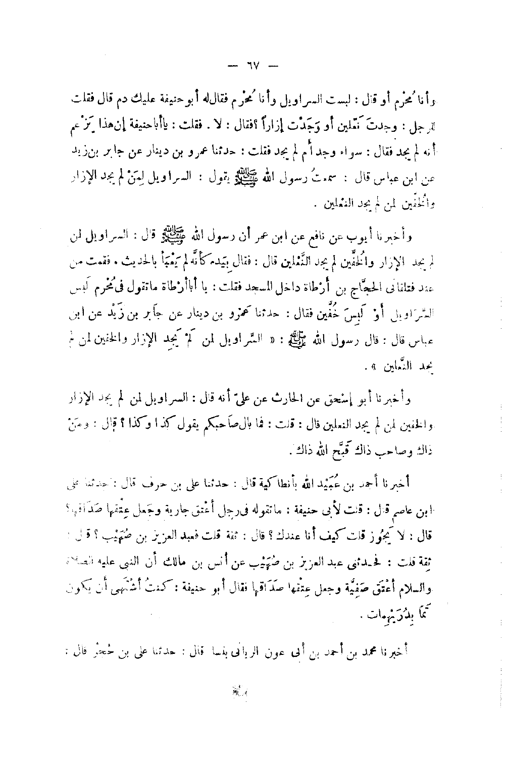 وَأَنَا مُحْرِمٌ أَوْ قَالَ لَبِسْتُ السَّرَاوِيلَ وَأَنَا مُحْرِمٌ فَقَالَ لَهُ أَبُو حَنِيفَةَ عَلَيْكَ دَمٌ قَالَ فَقُلْتُ لِلرَّجُلِ وَجَدْتُ نَعْلَيْنِ أَوْ وَجَدْتُ إِزَارًا فَقَالَ لَا فَقُلْتُ يَا أَبَا حَنِيفَةَ إِنَّ هَذَا يَزْعُمُ أَنَّهُ لَمْ يَجِدْ فَقَالَ سَوَاءَ وَجَدَ أَمْ لَمْ يَجِدْ فَقُلْتُ حَدَّثَنَا عَمْرُو بْنُ دِينَارٍ عَنْ جَابِرِ بْنِ زَيْدٍ عَنِ بن عَبَّاسٍ قَالَ سَمِعْتُ رَسُولَ اللَّهِ صَلَّى اللَّهُ عَلَيْهِ وَسَلَّمَ يَقُولُ السَّرَاوِيلُ لِمَنْ لَمْ يَجِدِ الإِزَارَ وَالْخُفَّيْنِ لِمَنْ لَمْ يَجِدِ النَّعْلَيْنِ وَأَخْبَرَنَا أَيُّوبُ عَنْ نَافِعٍ عَنِ بن عُمَرَ أَنَّ رَسُولَ اللَّهِ صَلَّى اللَّهُ عَلَيْهِ وَسَلَّمَ قَالَ السَّرَاوِيلُ لِمَنْ لَمْ يَجِدِ الإِزَارَ وَالْخُفَّيْنِ لَمْ يَجِدِ النَّعْلَيْنِ قَالَ فَقَالَ بِيَدِهِ كَأَنَّهُ لَمْ يَعْبَأْ بِالْحَدِيثِ فَقُمْتُ مِنْ عِنْدِهِ فَتَلَقَّانِي الْحَجَّاجُ بْنُ أَرْطَاةَ دَاخِلَ الْمَسْجِدِ فَقُلْتُ يَا أَبَا أَرْطَاةَ مَا تَقُولُ فِي مُحْرِمٍ لَبِسَ السَّرَاوِيلَ أَوْ لَبِسَ خُفَّيْنِ فَقَالَ حَدَّثَنَا عَمْرُو بْنُ دِينَارٍ عَنْ جَابِرِ بْنِ زيد عَن بن عَبَّاسٍ قَالَ قَالَ رَسُولُ اللَّهِ صَلَّى اللَّهُ عَلَيْهِ وَسَلَّمَ السَّرَاوِيلَ لِمَنْ لَمْ يَجِدِ الإِزَارَ وَالْخُفَّيْنِ لِمَنْ لَمْ يَجِدِ النَّعْلَيْنِ وَأَخْبَرَنَا أَبُو إِسْحَق عَنِ الْحَارِثِ عَنْ عَلِيٍّ أَنَّهُ قَالَ السَّرَاوِيلُ لِمَنْ لَمْ يَجِدِ الإِزَارَ وَالْخُفَّيْنِ لِمَنْ لَمْ يَجِدِ النَّعْلَيْنِ قَالَ قُلْتُ فَمَا بَالُ صَاحِبِكُمْ يَقُولُ كَذَا وَكَذَا قَالَ وَمَنْ ذَاكَ وَصَاحِبُ ذَاكَ قَبَّحَ اللَّهُ ذَاكَ أَخْبَرَنَا أَحْمَدُ بْنُ عُبَيْدِ اللَّهِ بِأَنْطَاكِيَةَ قَالَ حَدَّثَنَا عَلِيُّ بْنُ حَرْبٍ قَالَ حَدَّثَنَا عَلِيُّ بْنُ عَاصِمٍ قَالَ قُلْتُ لأَبِي حَنِيفَةَ مَا تَقُولُ فِي رَجُلٍ أَعْتَقَ جَارِيَةً وَجَعَلَ عِتْقَهَا صَدَاقَهَا قَالَ لَا يَجُوزُ قُلْتُ كَيْفَ أَنَا عِنْدَكَ قَالَ ثِقَةً قُلْتُ فَعَبْدُ الْعَزِيزِ بْنُ صُهَيْبٍ قَالَ ثِقَةً قُلْتُ فَحَدَّثَنِي عَبْدُ الْعَزِيزِ بْنُ صُهَيْبٍ عَنْ أَنَسِ بْنِ مَالِكٍ أَنَّ النَّبِيَّ صَلَّى الله عَلَيْهِ وَسلم أَعْتَقَ صَفِيَّةَ وَجَعَلَ عِتْقَهَا صَدَاقَهَا فَقَالَ أَبُو حَنِيفَةَ كُنْتُ أَشْتَهِي أَنْ يَكُونَ تما بِدُرَيْهِمَاتٍ أَخْبَرَنَا مُحَمَّد بن أَحْمد بن أبي عَوْنٍ الرَّيَّانِيُّ بِنَسَا قَالَ حَدَّثَنَا عَليّ بن حجر قَالَ