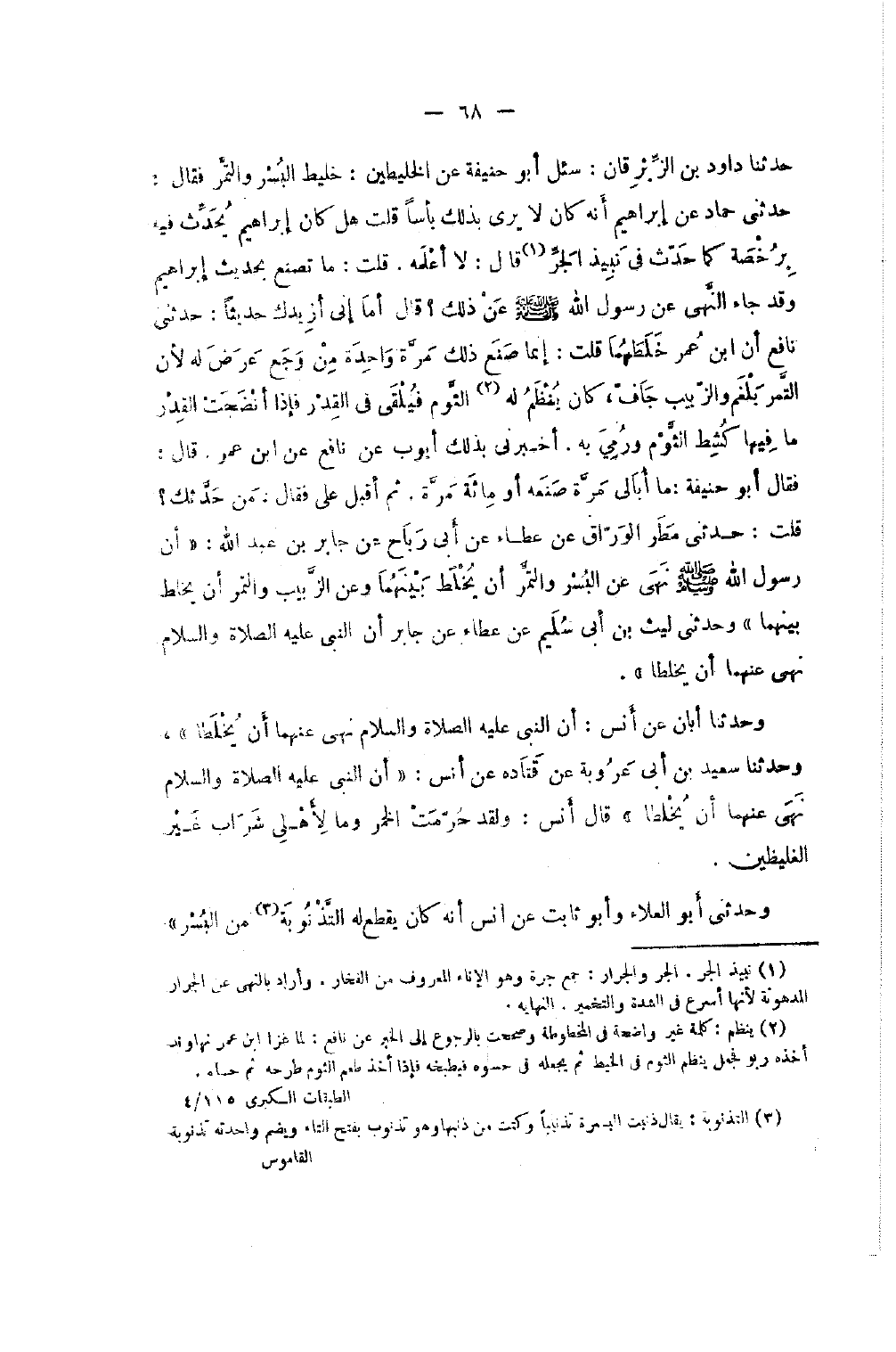 حَدَّثَنَا دَاوُدُ بْنُ الزِّبْرِقَانِ قَالَ سُئِلَ أَبُو حَنِيفَةَ عَنِ الْخَلِيطَيْنِ خَلِيطِ الْبُسْرِ وَالتَّمْرِ فَقَالَ حَدَّثَنِي حَمَّادٌ عَنْ إِبْرَاهِيمَ أَنَّهُ كَانَ لَا يَرَى بِذَلِكَ بَأْسًا قُلْتُ هَلْ كَانَ إِبْرَاهِيمُ يُحَدِّثُ فِيهِ بِرُخْصَةٍ كَمَا حَدَّثَ فِي نَبِيذِ الْجَرِّ قَالَ لَا أَعْلَمُهُ قُلْتُ مَا تَصْنَعُ بِحَدِيثِ إِبْرَاهِيمَ وَقَدْ جَاءَ النَّهْيُ عَنْ رَسُولِ اللَّهِ صَلَّى اللَّهُ عَلَيْهِ وَسَلَّمَ عَنْ ذَلِكَ قَالَ أَمَا إِنِّي أَزِيدُكَ حَدِيثا حَدثنِي نَافِع أَن بن عُمَرَ خَلَطَهُمَا قُلْتُ إِنَّمَا صَنَعَ ذَلِكَ مَرَّةً وَاحِدَةً مِنْ وَجَعٍ عَرَضَ لَهُ لأَنَّ التَّمْرَ بَلْغَمٌ وَالزَّبِيبَ جَافٌّ كَانَ يُنْظَمُ لَهُ الثَّوْمُ فَيُلْقَى فِي الْقِدْرِ فَإِذَا أَنْضَجَتِ الْقِدْرُ مَا فِيهَا كَشَطَ الثَّوْمَ وَرَمَى بِهِ أَخْبَرَنِي بِذَلِكَ أَيُّوب عَن نَافِع عَن بن عُمَرَ قَالَ فَقَالَ أَبُو حَنِيفَةَ مَا أُبَالِي مَرَّةً صَنَعَهُ أَوْ مِائَةَ مَرَّةٍ ثُمَّ أَقْبَلَ عَلَيَّ فَقَالَ مَنْ حَدَّثَكَ قُلْتُ حَدَّثَنِي مَطَرٌ الْوَرَّاقُ عَنْ عَطَاءِ بْنِ أَبِي رَبَاحٍ عَنْ جَابِرِ بْنِ عَبْدِ اللَّهِ أَنَّ رَسُولَ اللَّهِ صَلَّى اللَّهُ عَلَيْهِ وَسَلَّمَ نَهَى عَنِ الْبُسْرِ وَالتَّمْرِ أَنْ يُخْلَطَ بَيْنَهُمَا وَعَنِ الزَّبِيبِ وَالتَّمْرِ أَنْ يُخْلَطَ بَيْنَهُمَا وَحَدَّثَنِي لَيْثُ بْنُ أَبِي سُلَيْمٍ عَنْ عَطَاءٍ عَنْ جَابِرٍ أَنَّ النَّبِيَّ صَلَّى اللَّهُ عَلَيْهِ وَسَلَّمَ نَهَى عَنْهُمَا أَنْ يُخْلَطَا وَحَدَّثَنَا أَبَانٌ عَنْ أَنَسٍ أَن النَّبِي صَلَّى اللَّهُ عَلَيْهِ وَسَلَّمَ نَهَى عَنْهُمَا أَنْ يُخْلَطَا وَحَدَّثَنَا سَعِيدُ بْنُ أَبِي عَرُوبَةَ عَنْ قَتَادَةَ عَنْ أَنَسٍ أَنَّ النَّبِي صَلَّى اللَّهُ عَلَيْهِ وَسَلَّمَ نَهَى عَنْهُمَا أَنْ يُخْلَطَا قَالَ أَنَسٌ وَلَقَدْ حُرِّمَتِ الْخَمْرُ وَما لأَهْلِي شَرَابٌ غَيْرَ الْغَلِيظَيْنِ وَحَدَّثَنِي أَبُو الْعَلاءِ وَأَبُو ثَابِتٍ عَنْ أَنَسٍ أَنَّهُ كَانَ يُقْطَعُ لَهُ التذنوبة من الْبُسْر